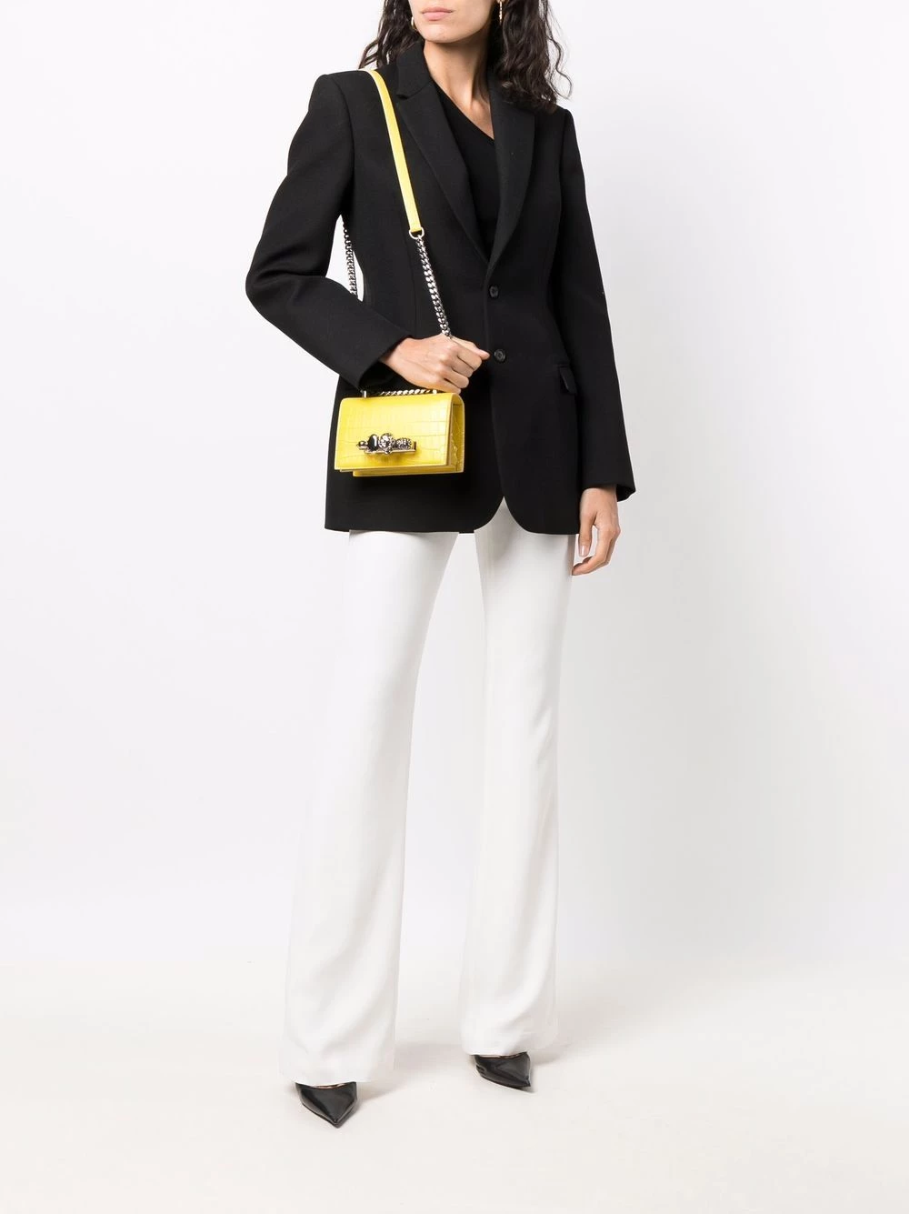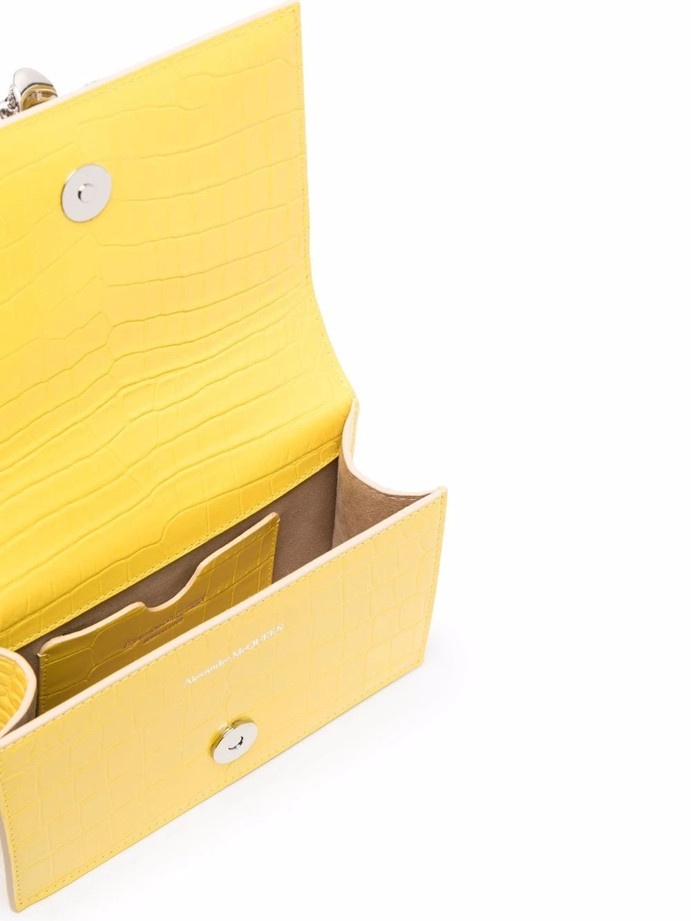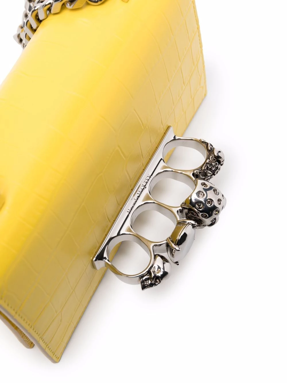 This AW21, Alexander McQueen gives accessories the tough treatment with this Jewelled satchel crossbody bag. With the option to carry it using the silver-tone knuckleduster, it allows the wearer to have multiple styling options. Adorned with the brand’s signature skull motif, this accessory is finished with a crocodile effect.