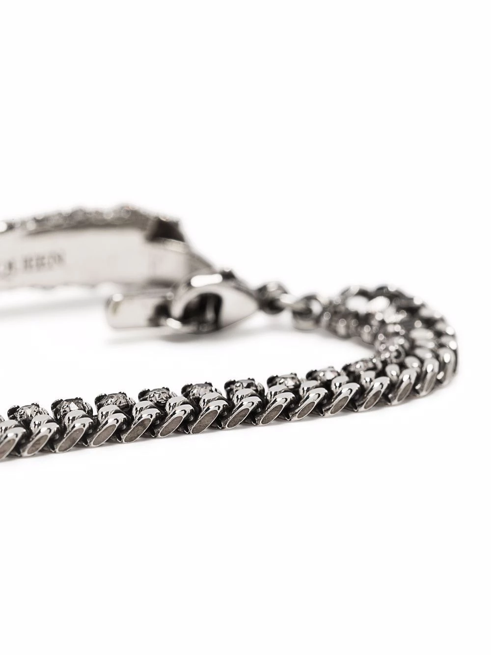 Alexander McQueen’s unique aesthetic is seen in this one-of-a-kind single molten earcuff that draws the eye with its long chain and radiant pave crystal embellished top that sits across the ear for a distinct edge.
