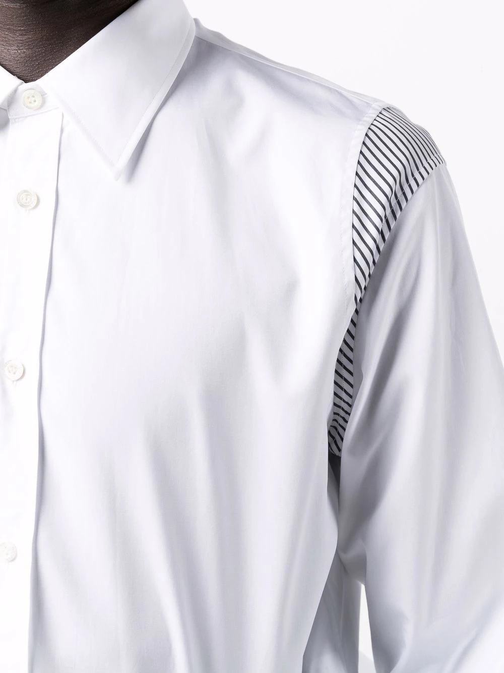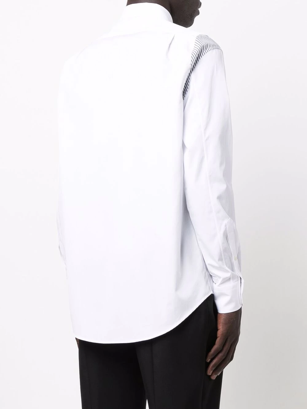 Alexander McQueen re-works the classic work shirt with striped insert panels at each shoulder. Crafted from crisp cotton, the long sleeve silhouette is finished with a pointed collar and curved hemline.