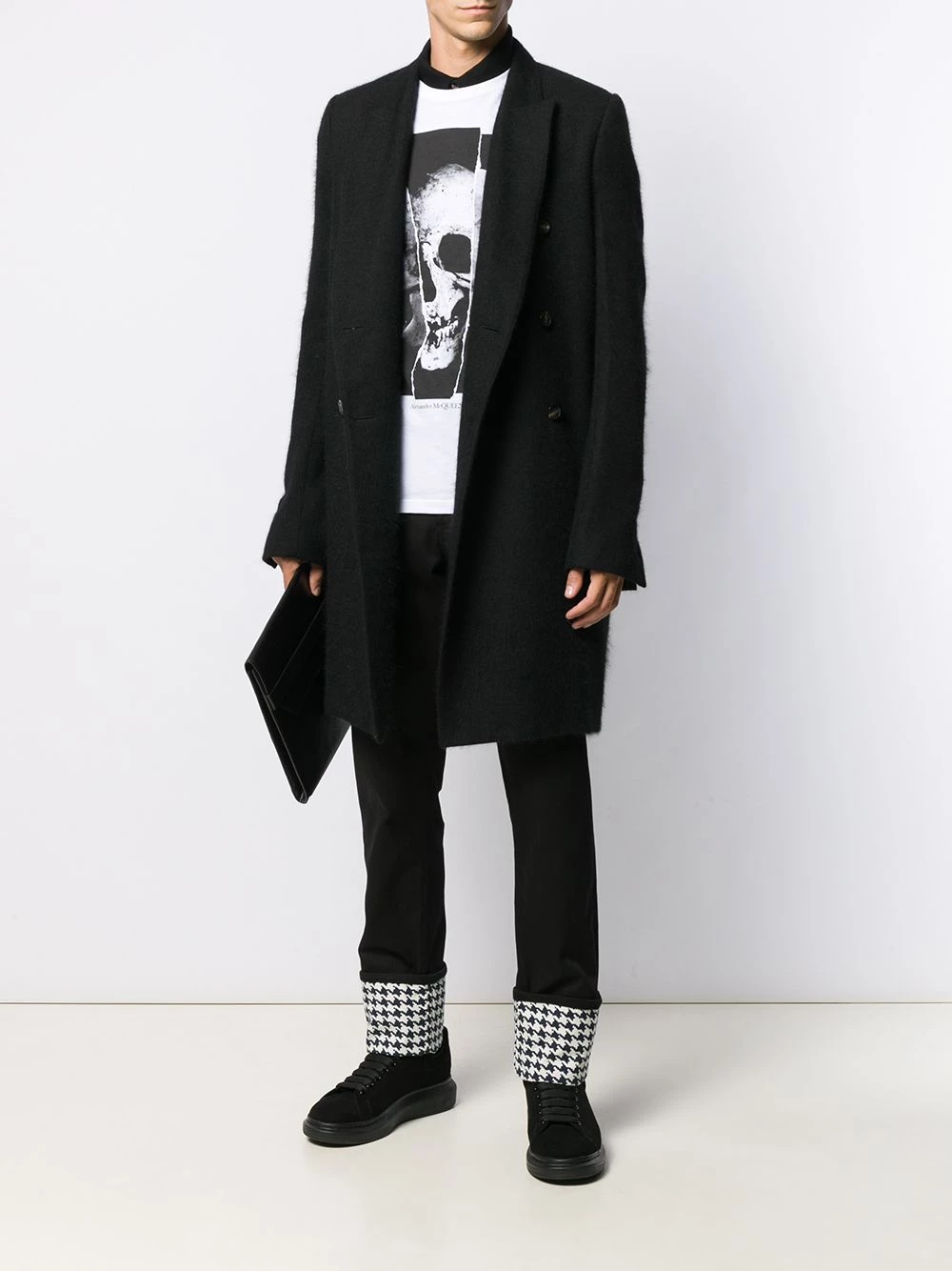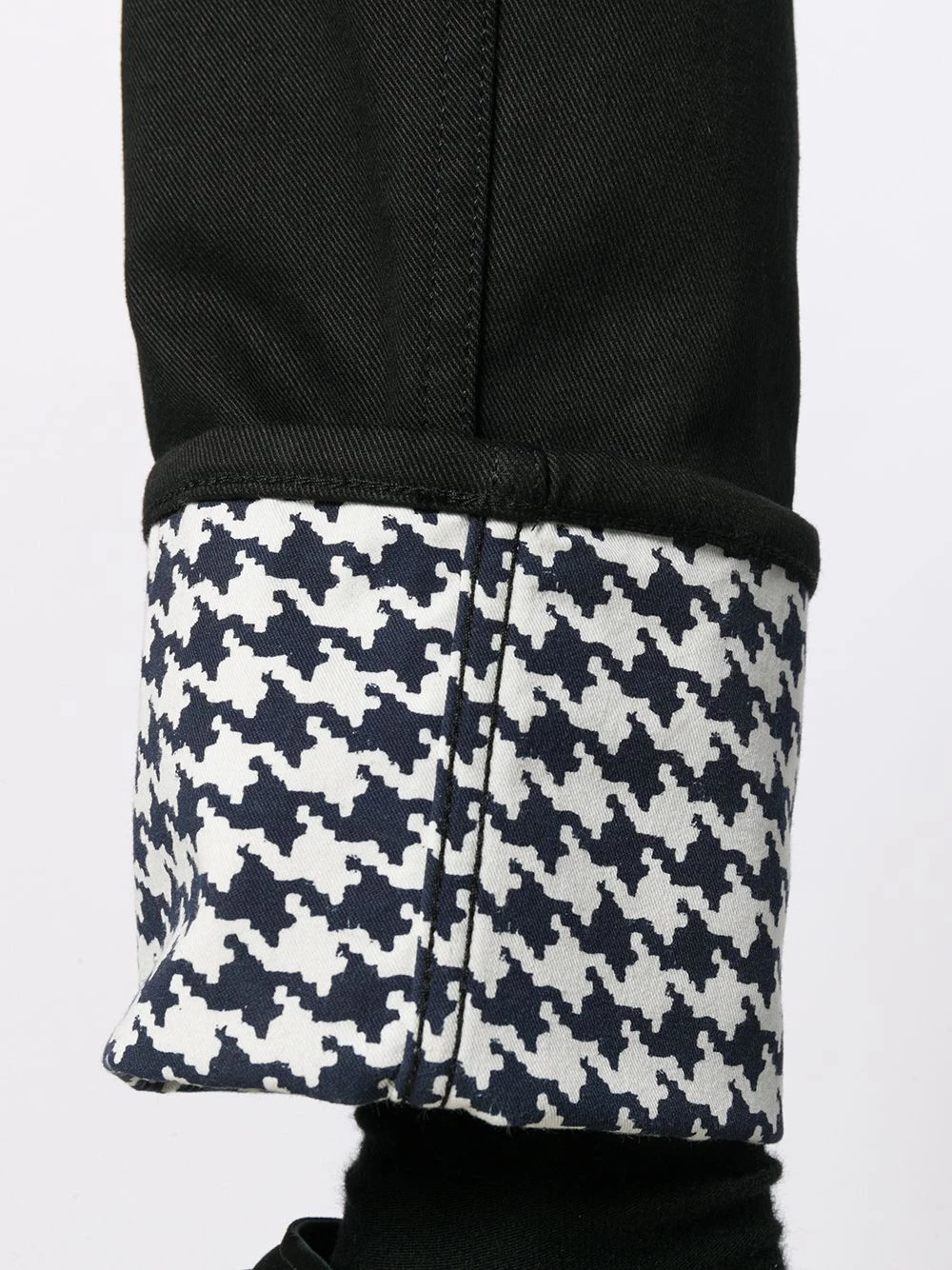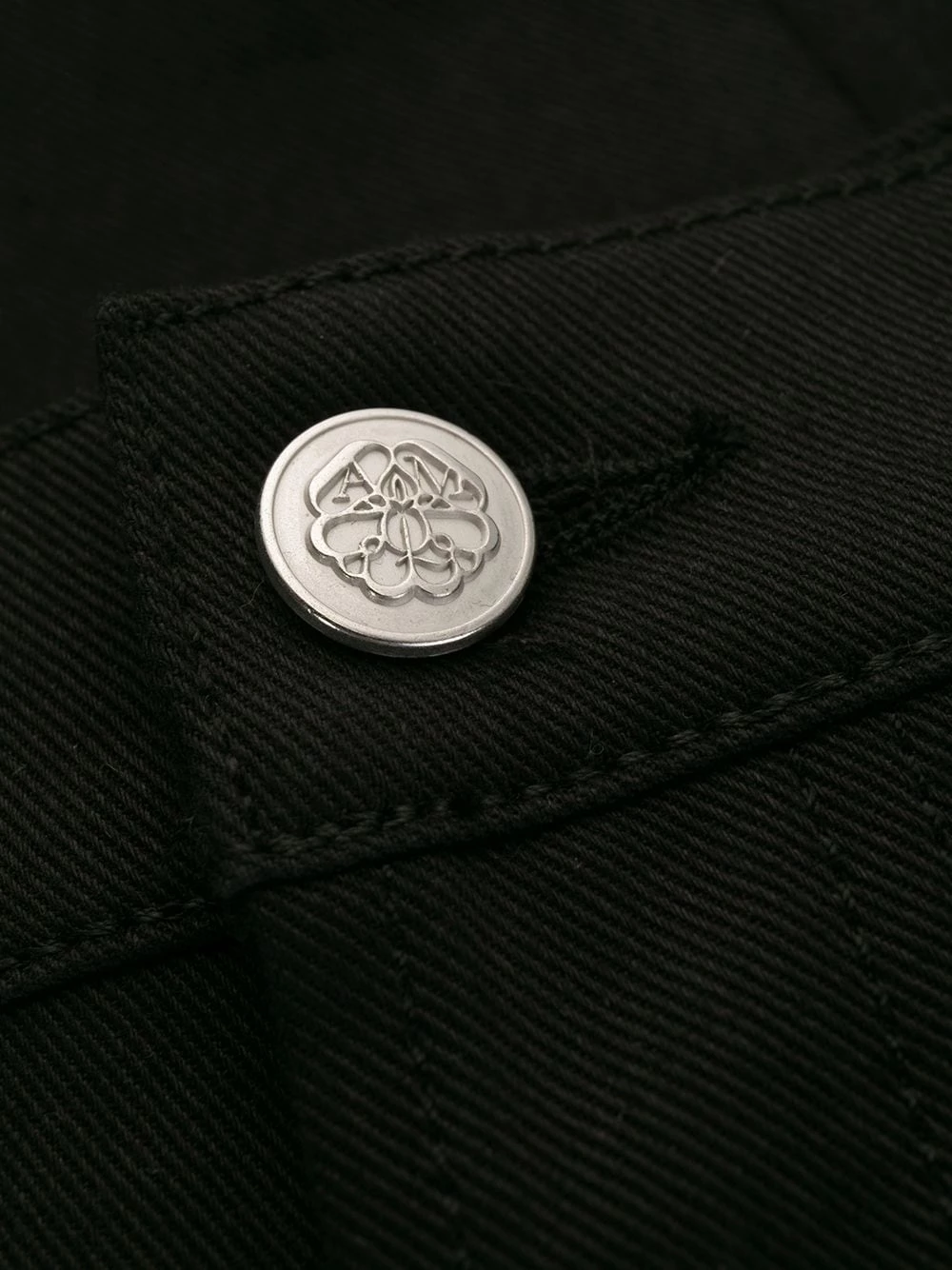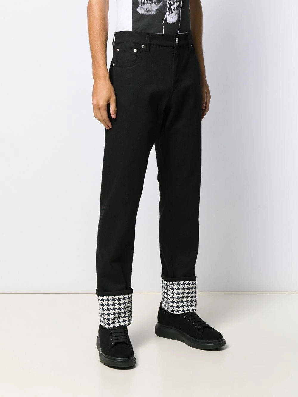 Restlessly inserting light punk rock references to traditional pieces, Alexander McQueen’s design embodies attitude and provoking statements. Crafted from black cotton, these dogtooth cuff jeans feature a button and zip fly, belt loops, a five pocket design, a slim fit and turn up cuffs.