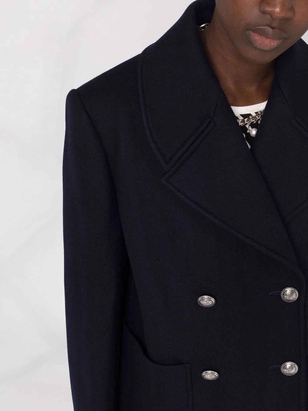 Alexander McQueen’s coat showcases the British brand’s tailoring expertise. Crafted from wool with a touch of cashmere, this navy iteration is designed with modern notched lapels in a sleek double-breasted silhouette.