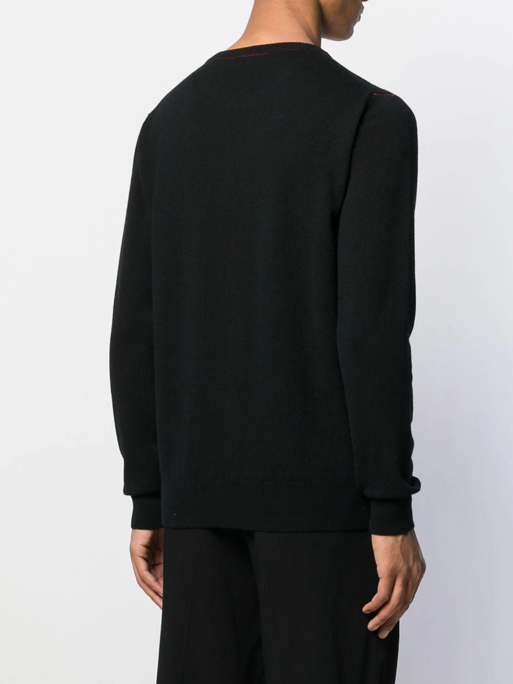 Restlessly inserting light punk rock references to traditional pieces, Alexander McQueen is the place of birth of attitude and statements, as seen in this black wool-blend embroidered logo jumper. Featuring long sleeves, a ribbed crew neck, an all-over ribbed texture, a red stitching detail at the top and red signature initials at the hem.