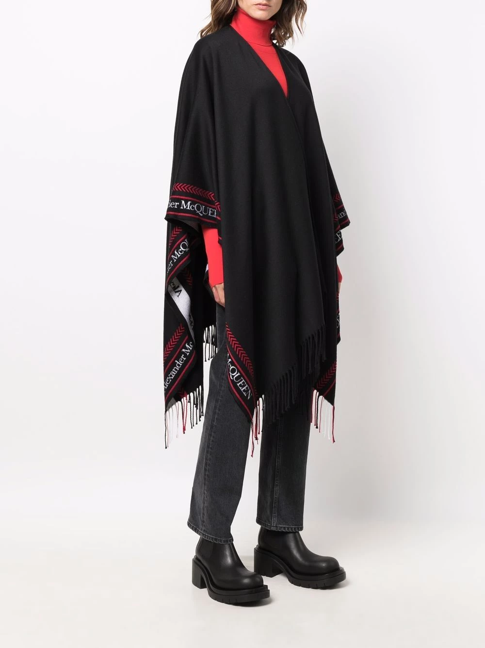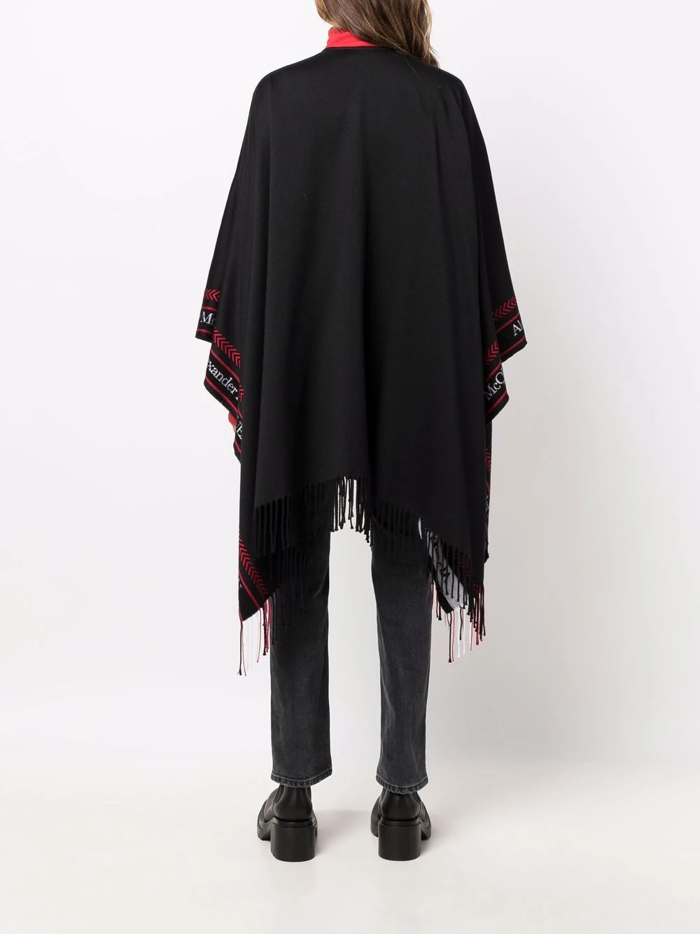 Black wool-blend fringed knit logo-edge poncho from Alexander McQueen featuring knitted construction, logo trim, fringe detailing, open front and short sleeves.