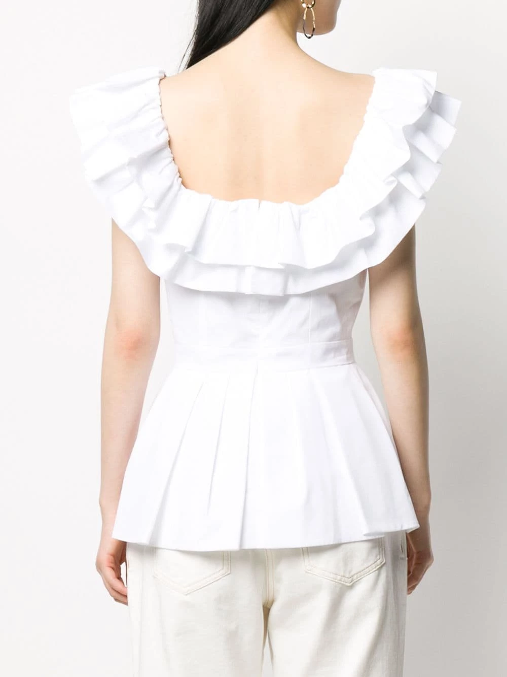 You’re not a dramatic person – your clothes, however, take centre stage. This white cotton ruffle peplum blouse from Alexander McQueen will give your looks all the theatricals it needs. Lights, camera, action! Featuring a scoop neck, a ruffle trimming, a peplum hem and a sleeveless design.