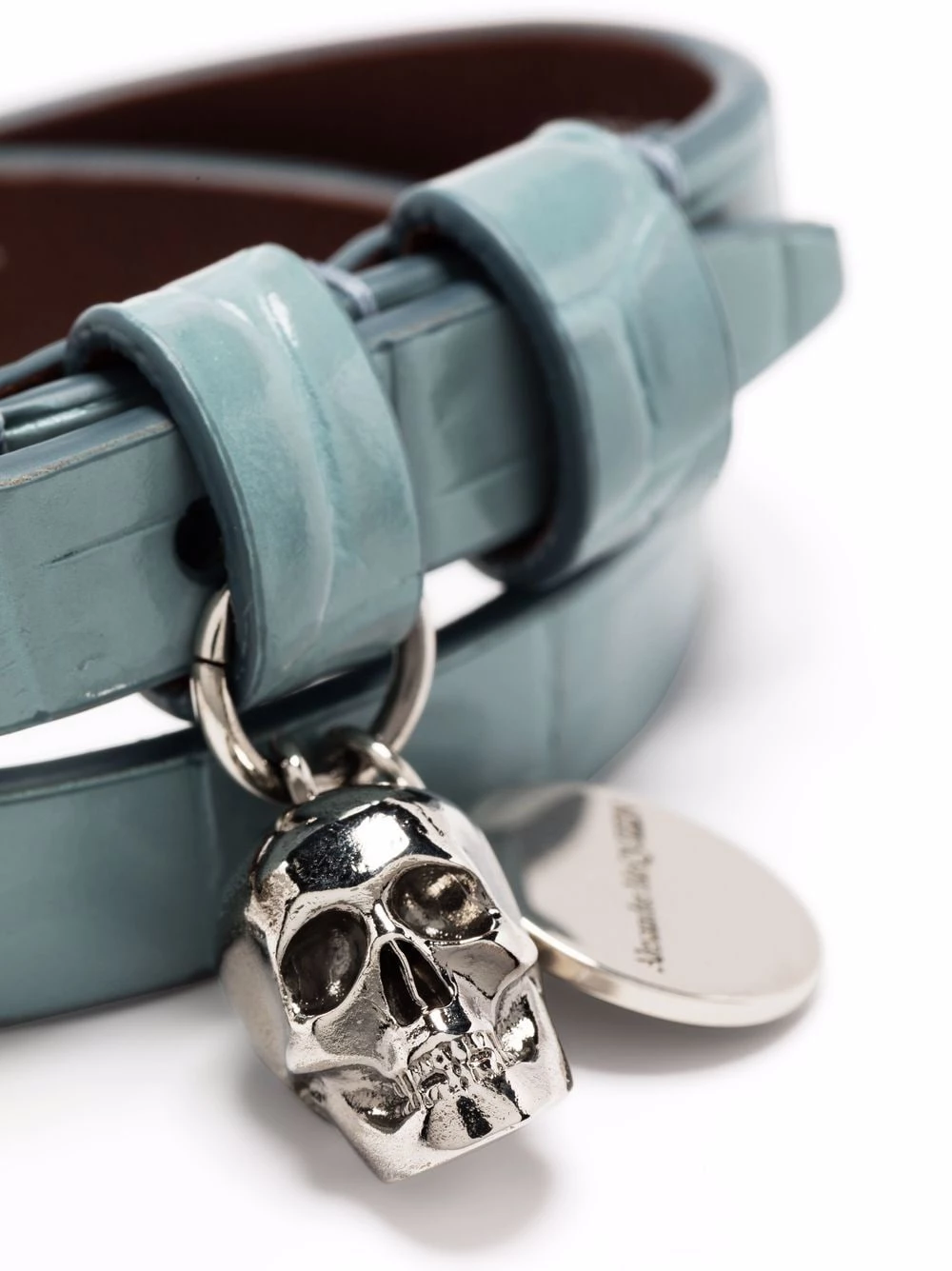 Alexander McQueenโs skull design is an instantly recognisable motif. Constructed from croc-embossed leather, this wrap bracelet fastens with an adjustable buckle and is detailed with the iconic skull in the form of a charm, providing the signature edge associated with the label.