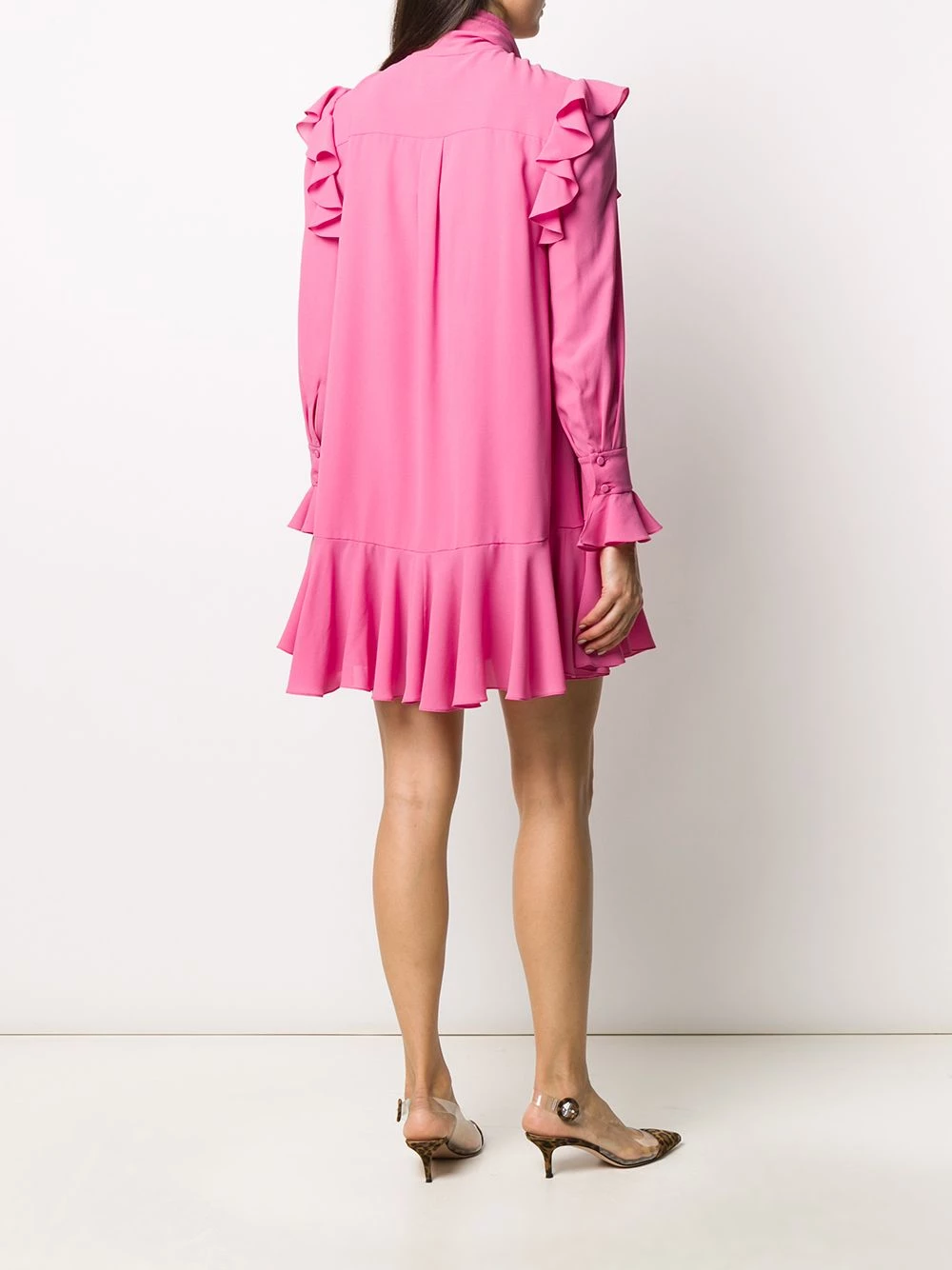 On the hunt for something flirty and feminine? Well, look no further than this tie-neck ruffle dress from Alexander McQueen. The flounced ruffle hemline adds a girlish touch to the design. Featuring a tied neckline, a ruffled hem, a short length and ruffled shoulders.