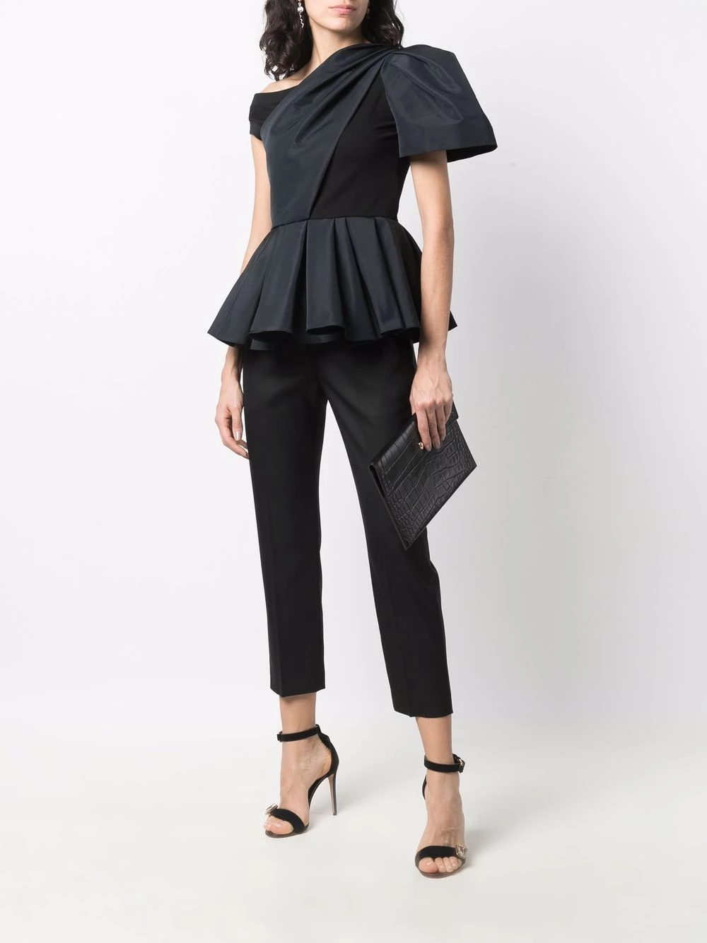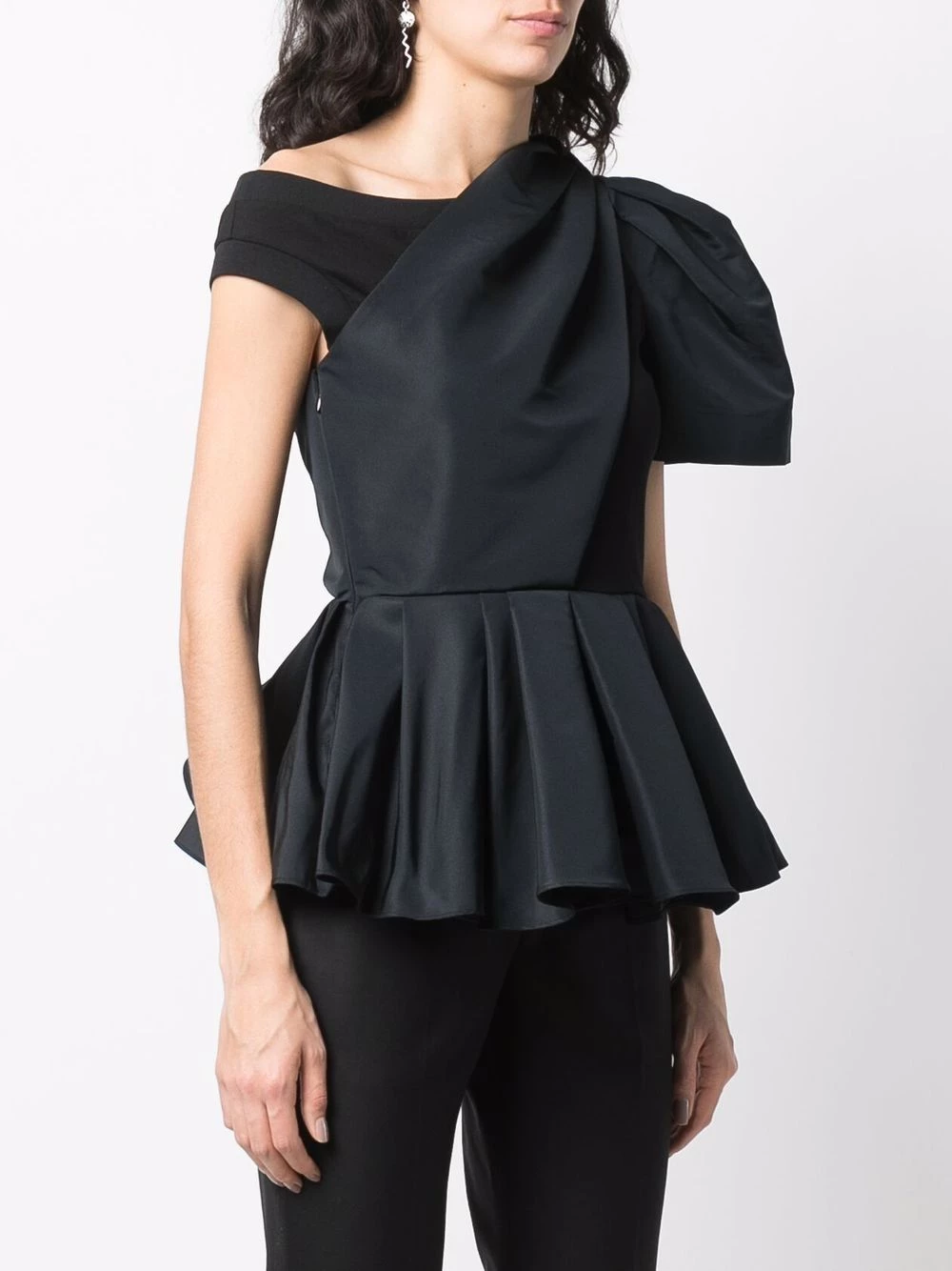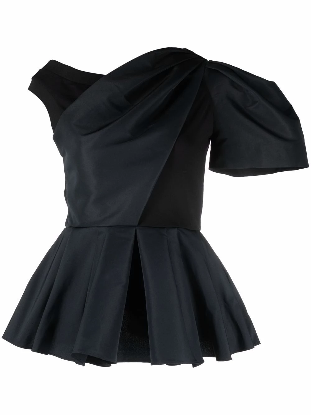 Asymmetric in design, this black cotton top from Alexander McQueen boasts a single short sleeve and an angle-cut neckline. For a voluminous flair, the style has a ruffled peplum waist.