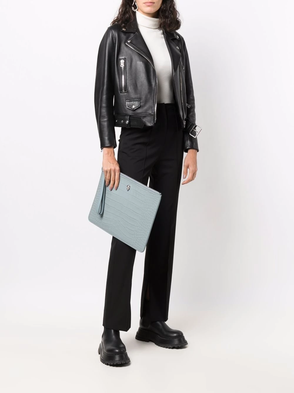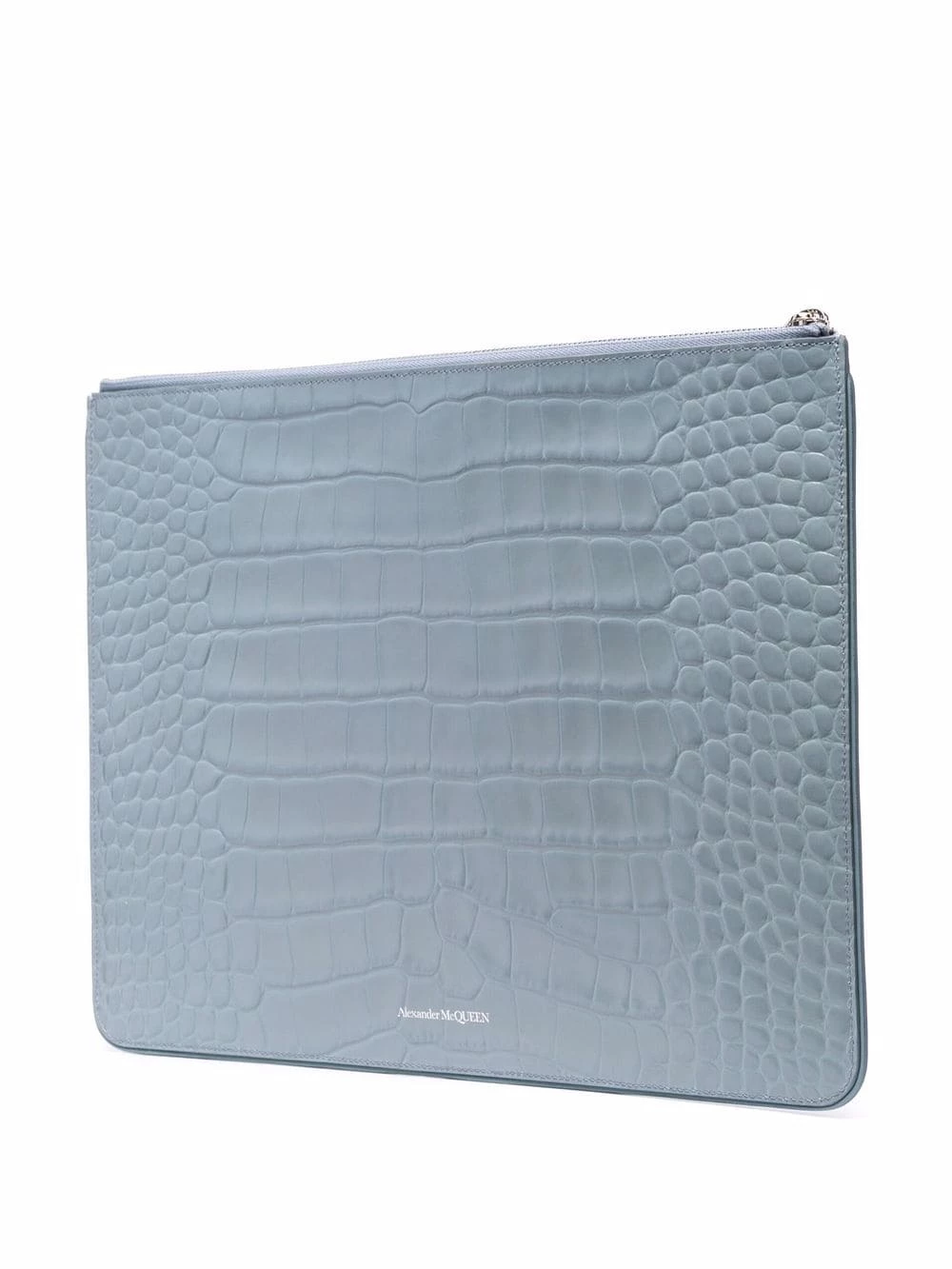 Alexander McQueen is renowned for a gothic yet glamorous design style. This is showcased in the crocodile-effect and silver-tone hardware skull stud emellishment on this clutch bag.