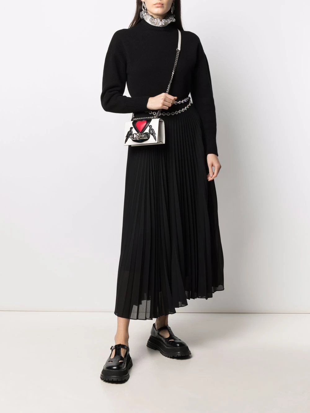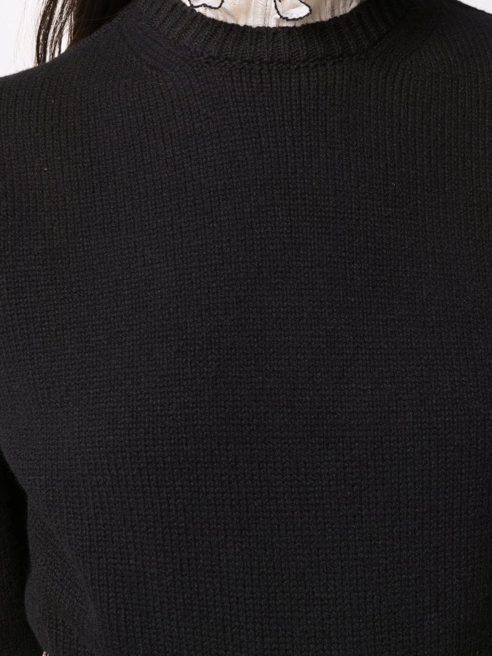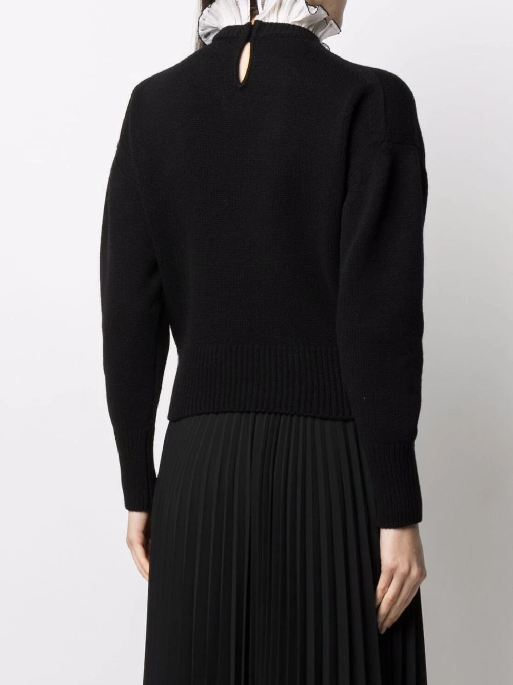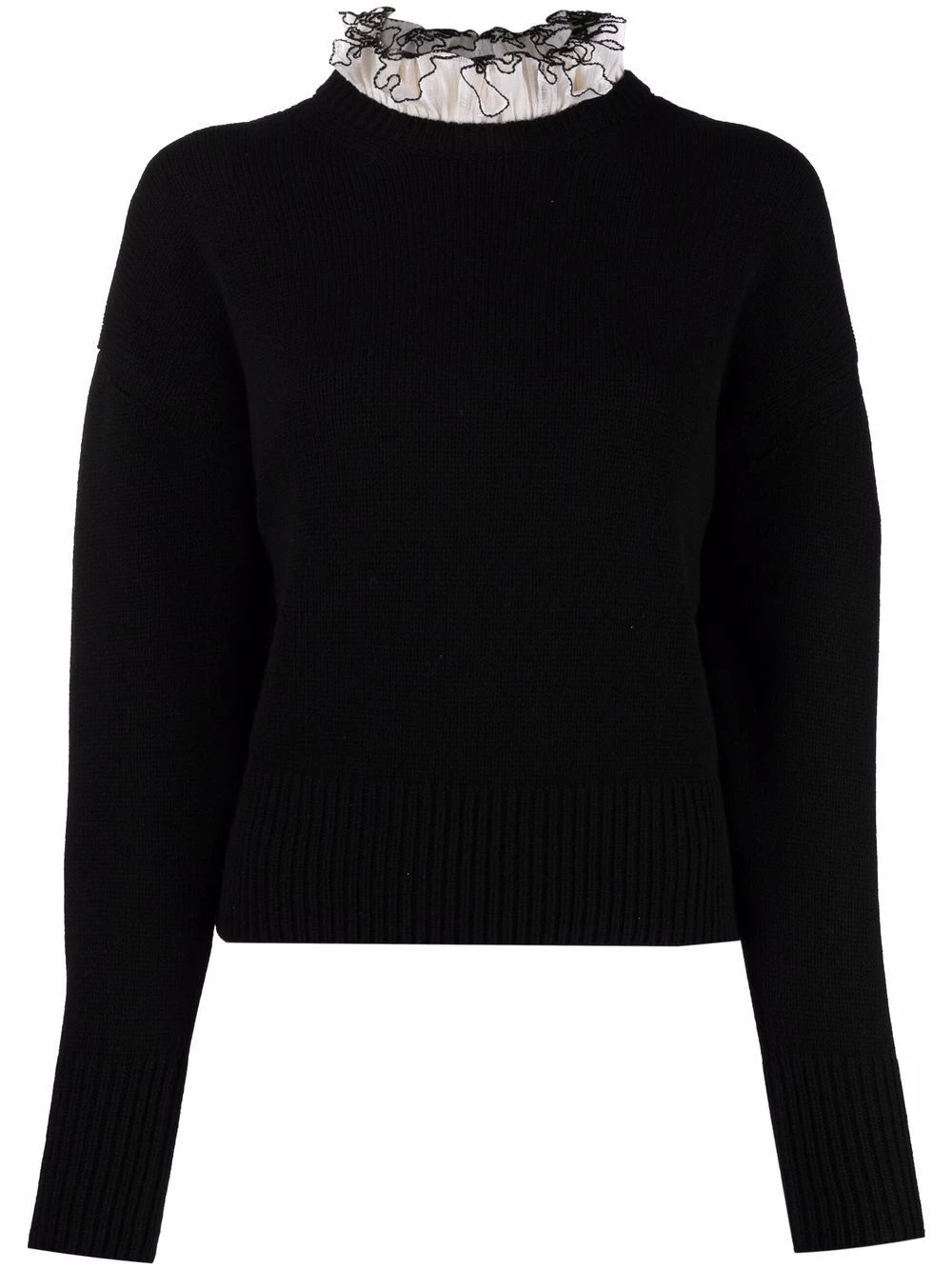 Elegance is at the centre of this Alexander McQueen jumper, a piece crafted from contrasting wool and delicate silk fabrics. The high collar features tipping details whilst a closer look reveals the subtle distressed effects on the ivory-tone frills.