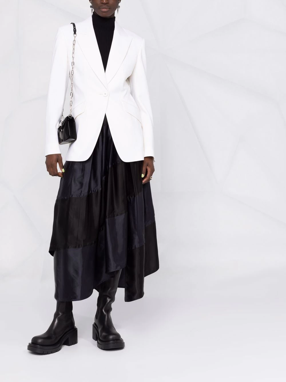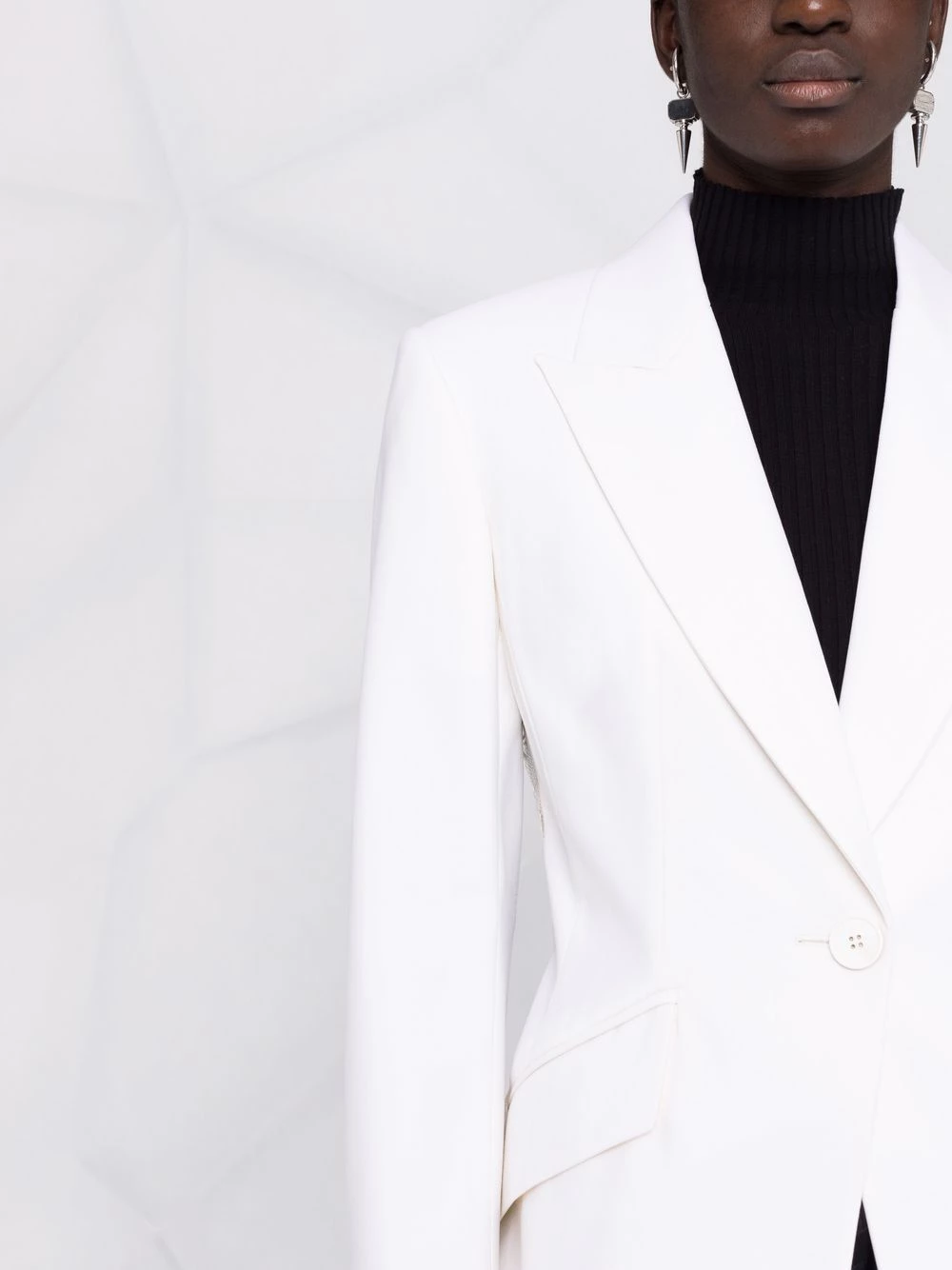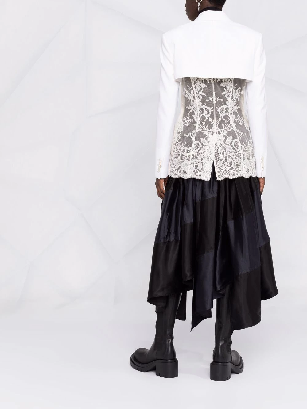 Alexander McQueen combines two of its signatures, drama and tailoring, to create this unique single-breasted blazer. A refined hourglass silhouette is showcased from the front, whilst the back tells a story of romance using delicate floral-lace panelling and a scalloped hem.
