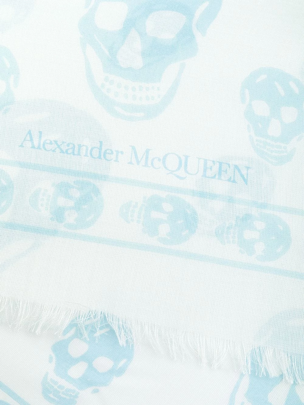 Incorporate Alexander McQueen’s signature skull motif into everyday looks with this iconic blue scarf. Featuring frayed edges and a logo print, this coveted skull stamped piece exudes edge and sophistication; trademarks of the Alexander McQueen brand.
