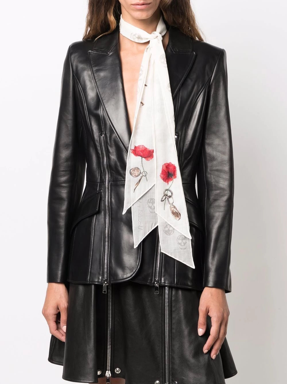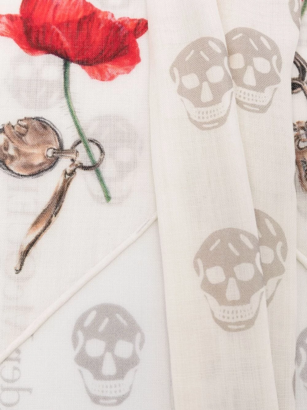 Alexander McQueen’s decadent spirit is portraited in this wool scarf. A white wool background is adorned with the brand’s iconic Skull motif and red roses for a touch of the house’s iconic dark romanticism.