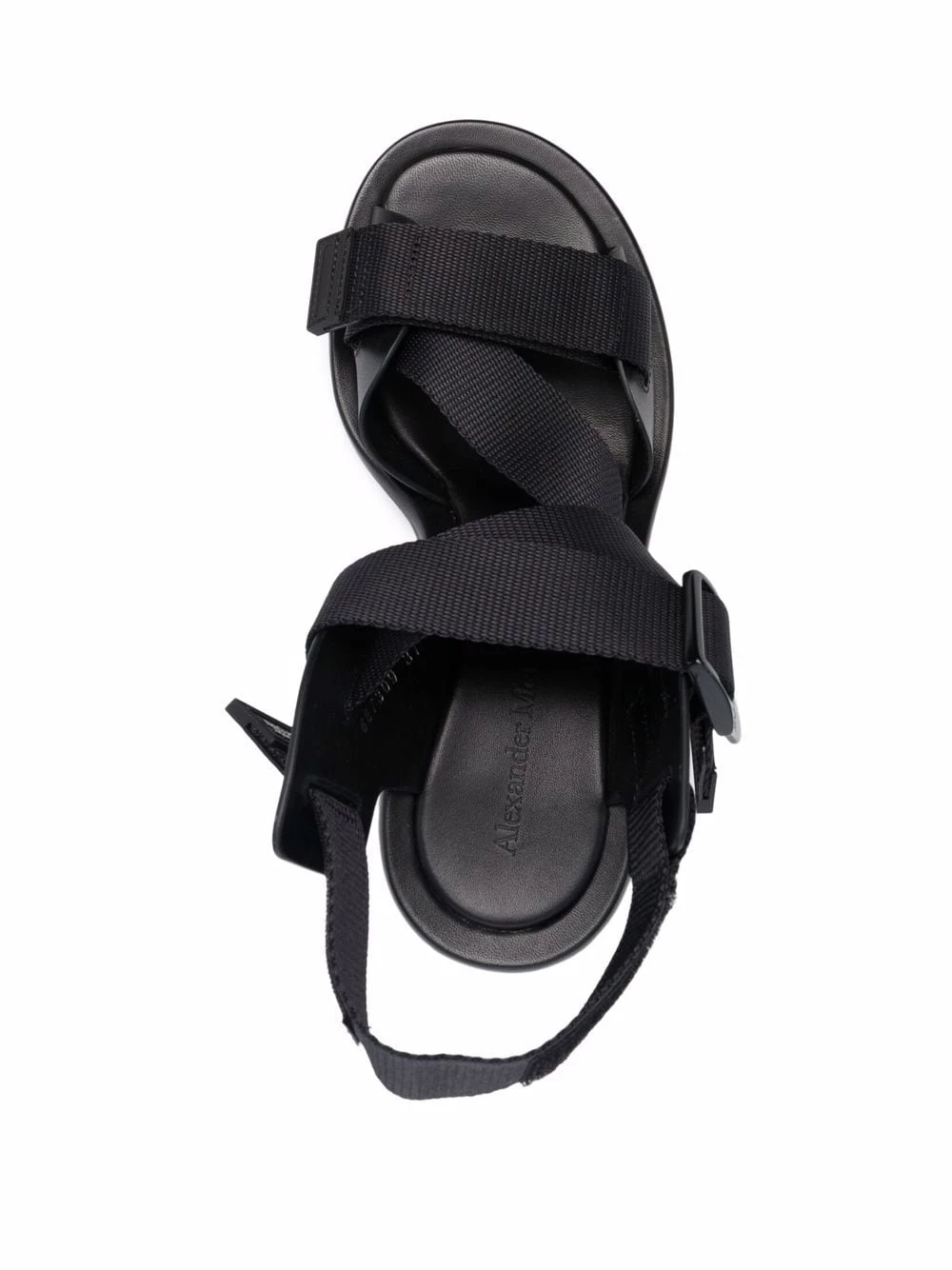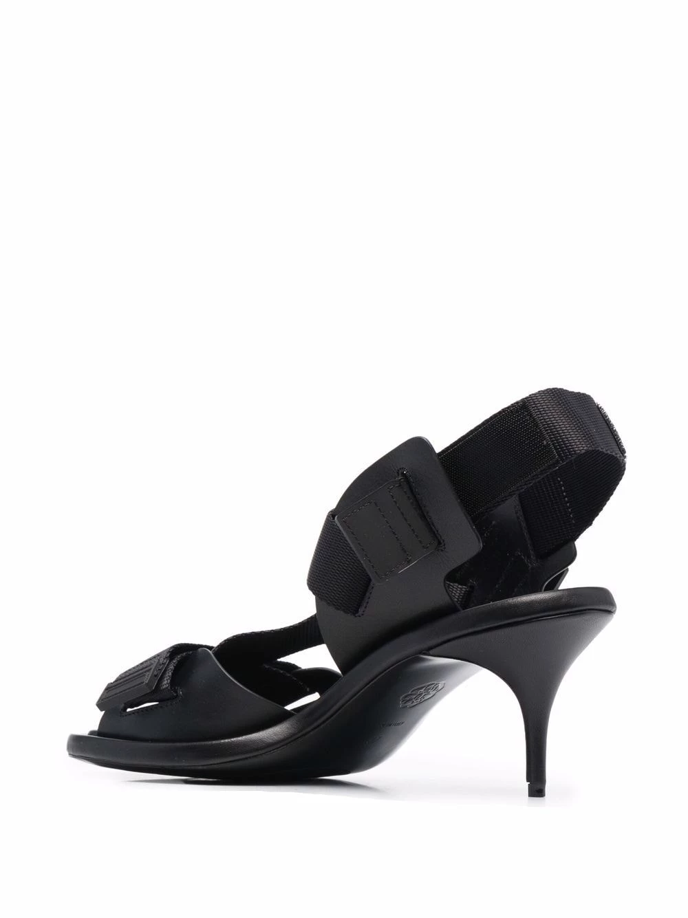 Black leather slingback buckled leather sandals from Alexander McQueen featuring buckle-fastening slingback strap, open toe, slip-on style, branded leather insole and kitten heel.