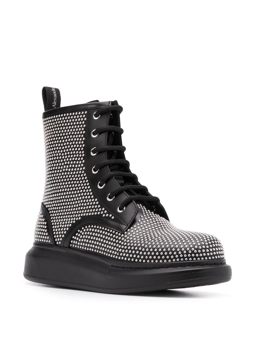 Nothing says “Get out of my way!” like this pair of studded lace-up ankle boots from Alexander McQueen. The all-over stud detail suggests that you are a force to be reckoned with. Add this to any outfit to instantly toughen it up. Featuring micro stud details, a platform sole, a round toe, an ankle length and a pull tab at the rear.