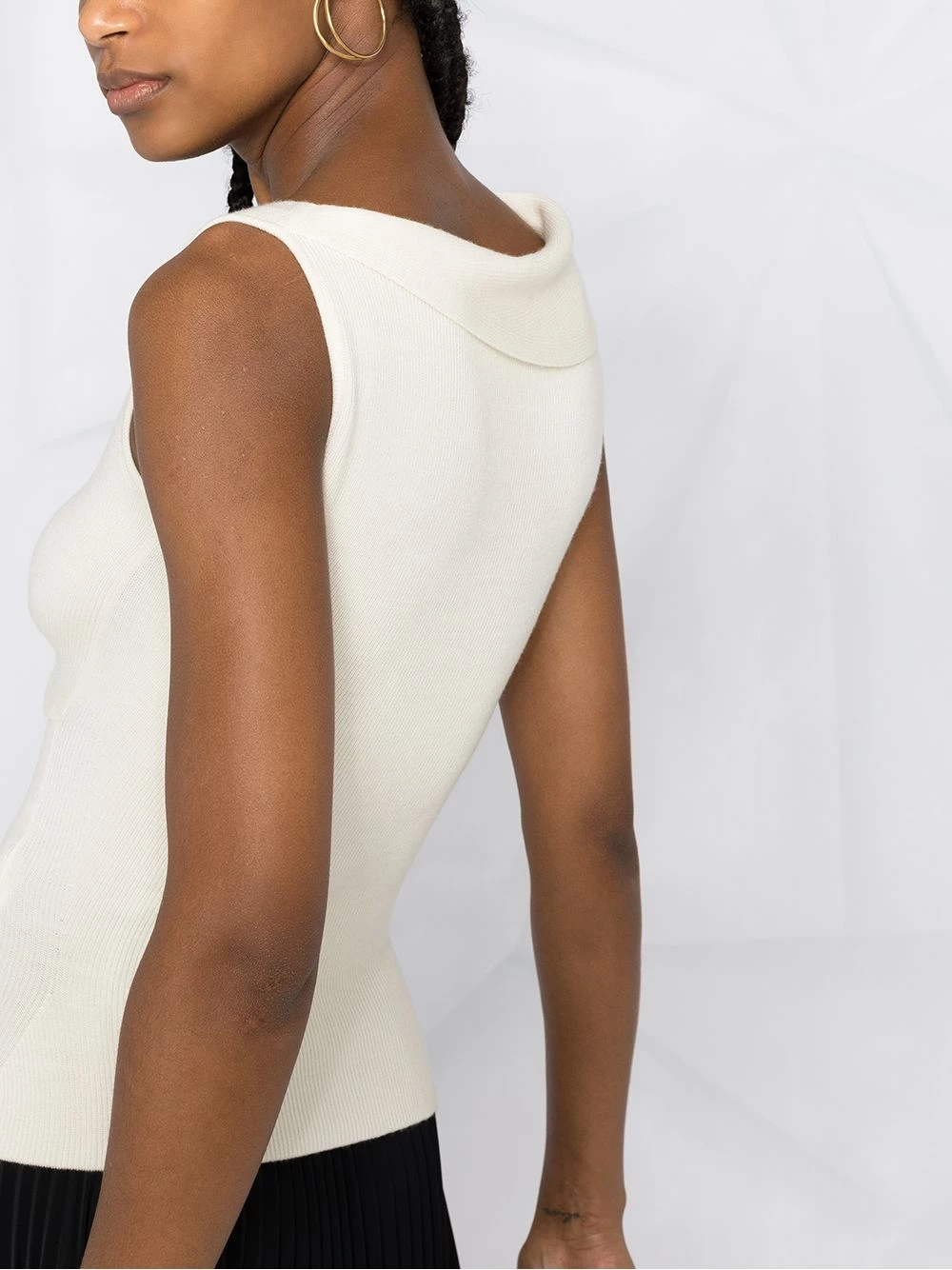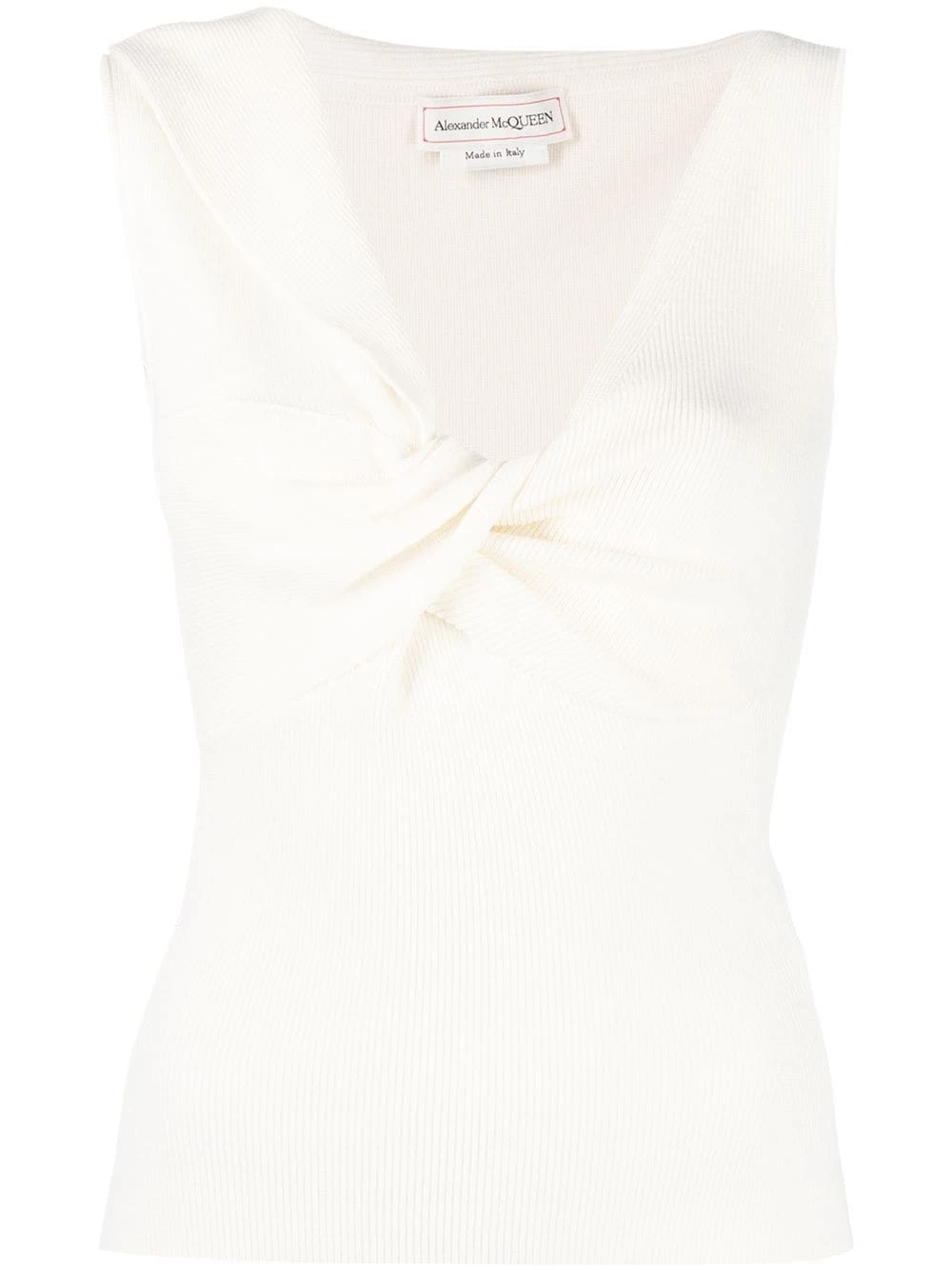 You know that feeling when you really want to go to the party but it’s too cold outside? Alexander McQueen clearly does. That’s why they came out with this twist-front top, knitted from a warm ivory wool. You can thank us later.ย