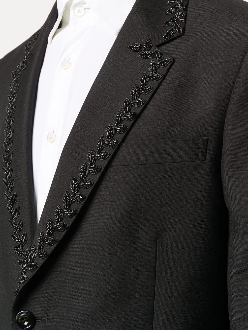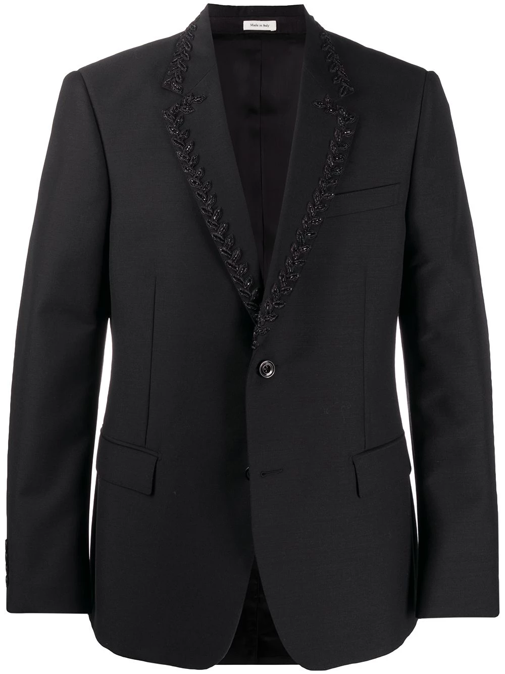 An Alexander McQueen blazer is anything but basic. Constructed from black wool-mohair blend, this single-breasted jacket from Alexander McQueen is trimmed with beading along the notch lapels. Do things differently.
