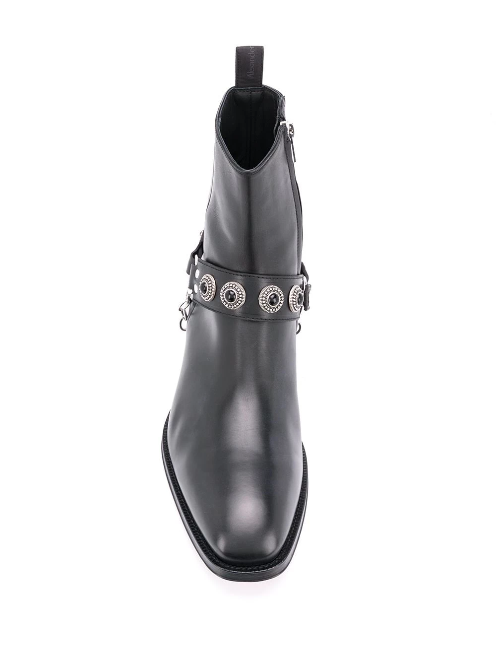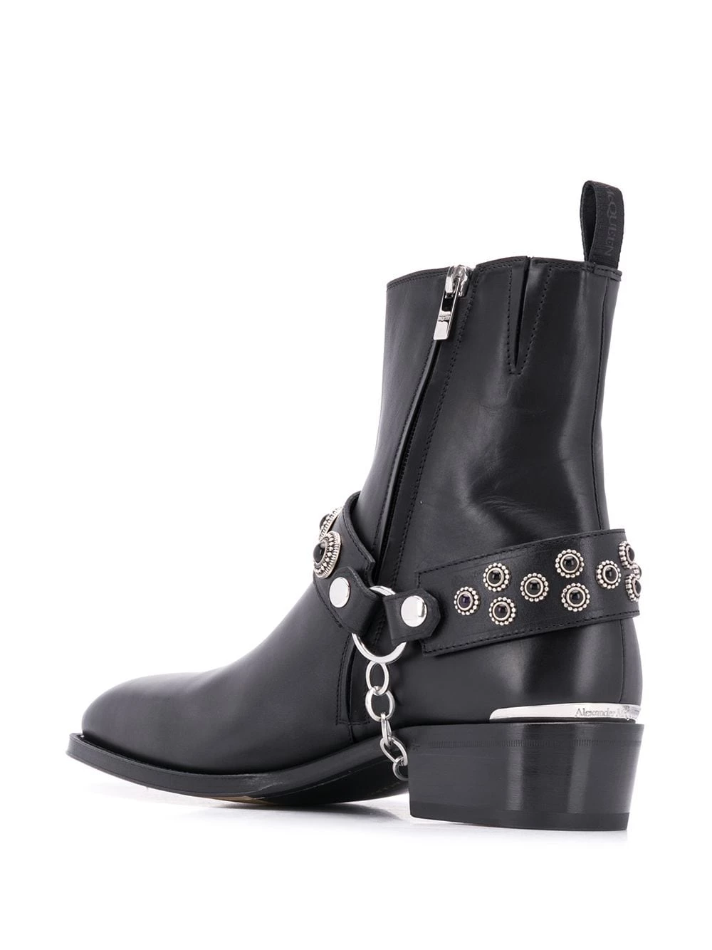 Restlessly inserting light punk rock references to traditional pieces, Alexander McQueen is the place of birth of attitude and statements, as seen with these black leather Harness Cuban heel boots. Featuring a pull tab at the rear, an almond toe, a detachable jewelled harness and a stacked Cuban heel. Please note that Alexander McQueen’s items no longer come with a dust bag.