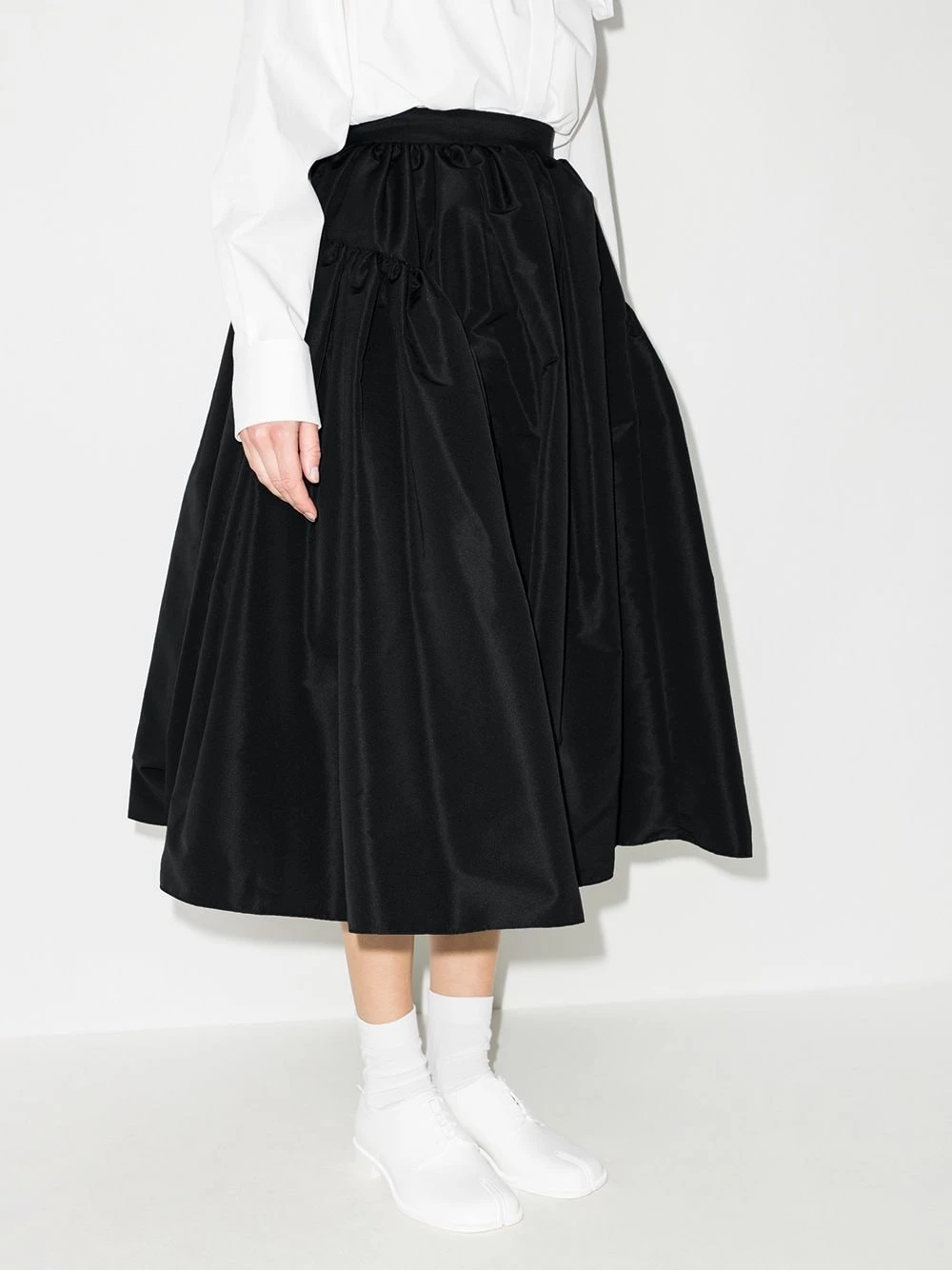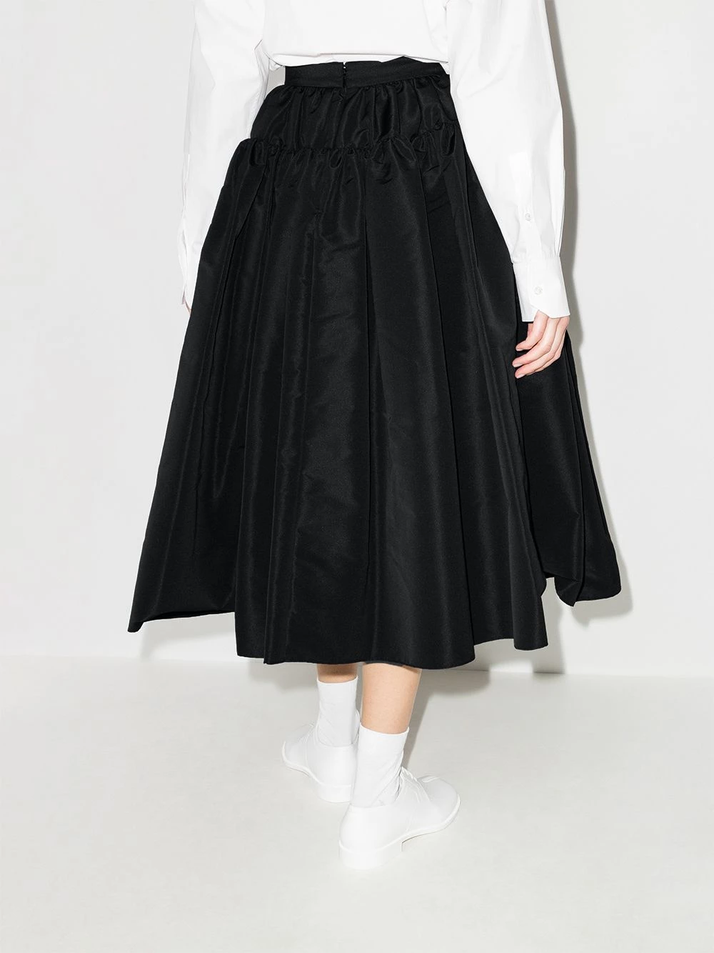 Alexander McQueen keeps it effortlessly simple with this black full midi skirt. Designed with gathered-edge panels, this voluminous piece is refined elegance at its best.