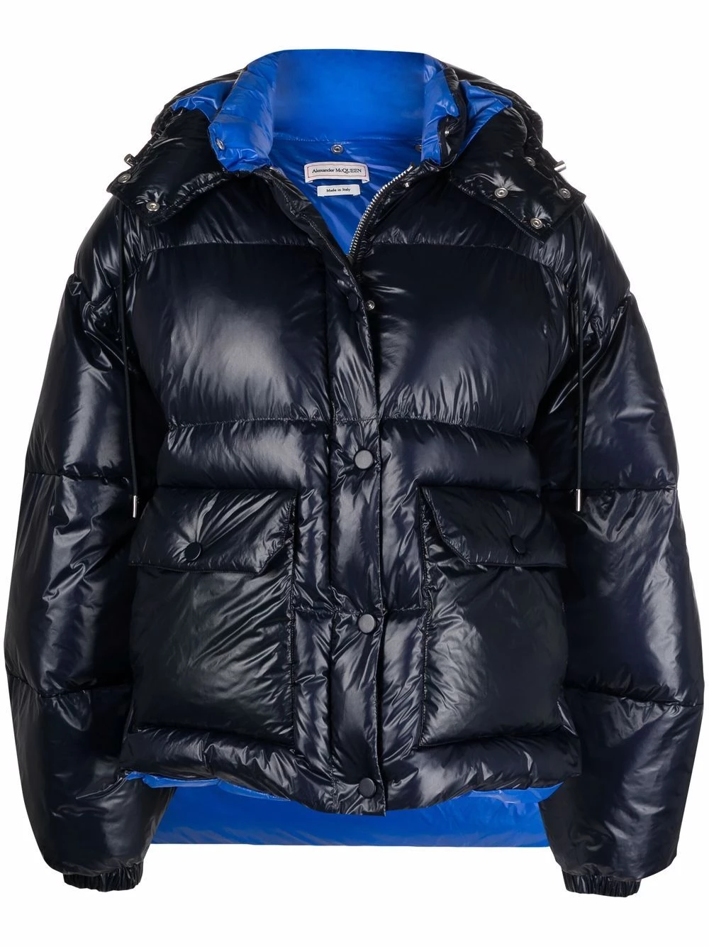 British brand, Alexander McQueen extends its avant-garde aesthetic to its edit of outerwear as this blue coat demonstrates. Designed with a padded lining for an insulated feel, this hooded jacket boasts a high-low hem for an unexpected silhouette.