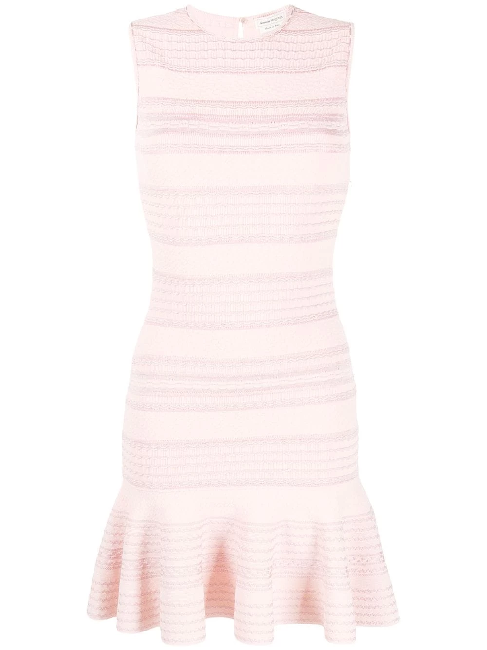 Be pretty in pink. Crafted in a silk-blend, this magnolia pink scalloped dress from Alexander McQueen sports short peplum hem. Go mini. Featuring a round neck, a fitted silhouette and a peplum hem.