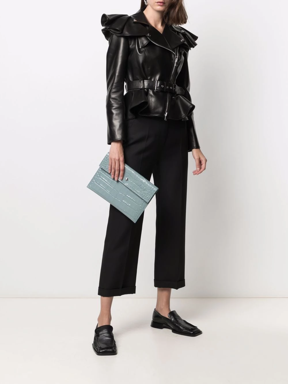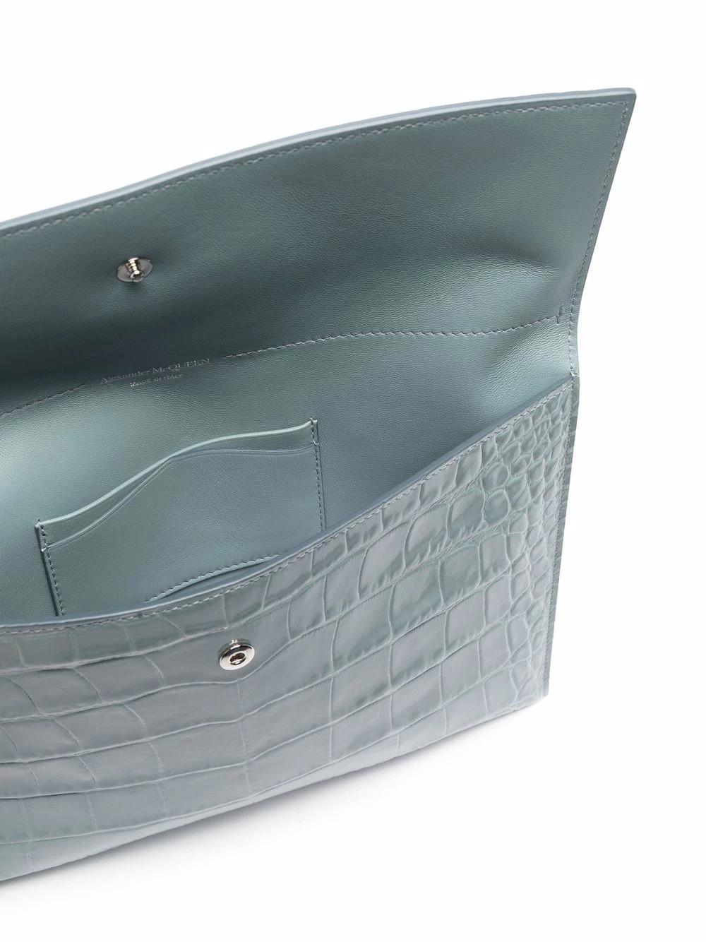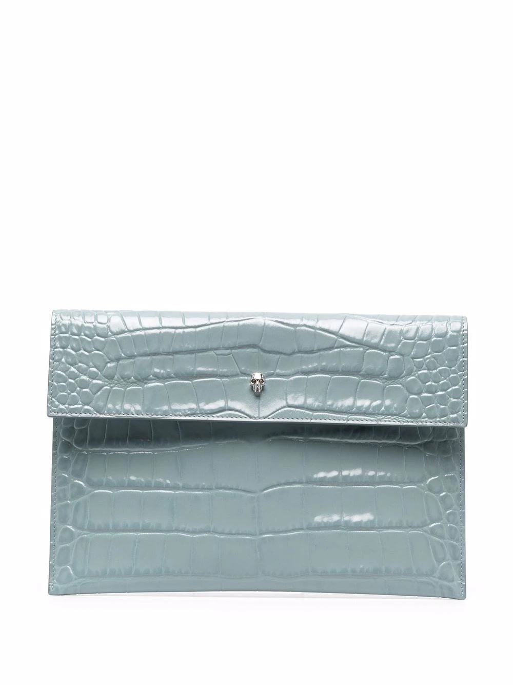 Alluring elegance on the go. In true Alexander McQueen style, this clutch bag is finished with a metallic skull detail to the front. The perfect companion.