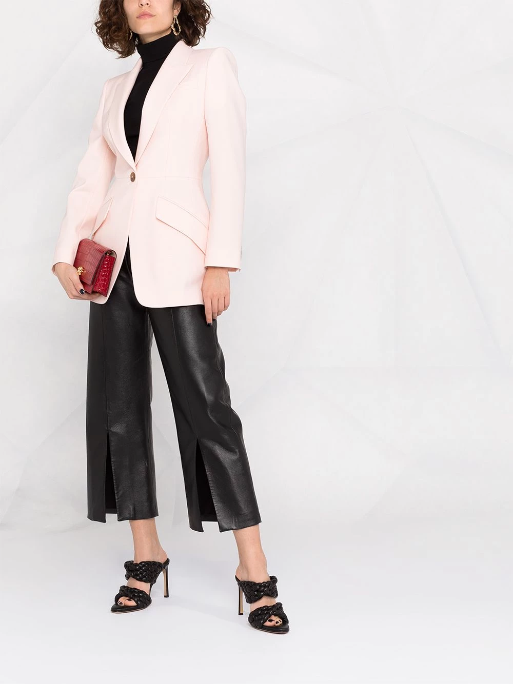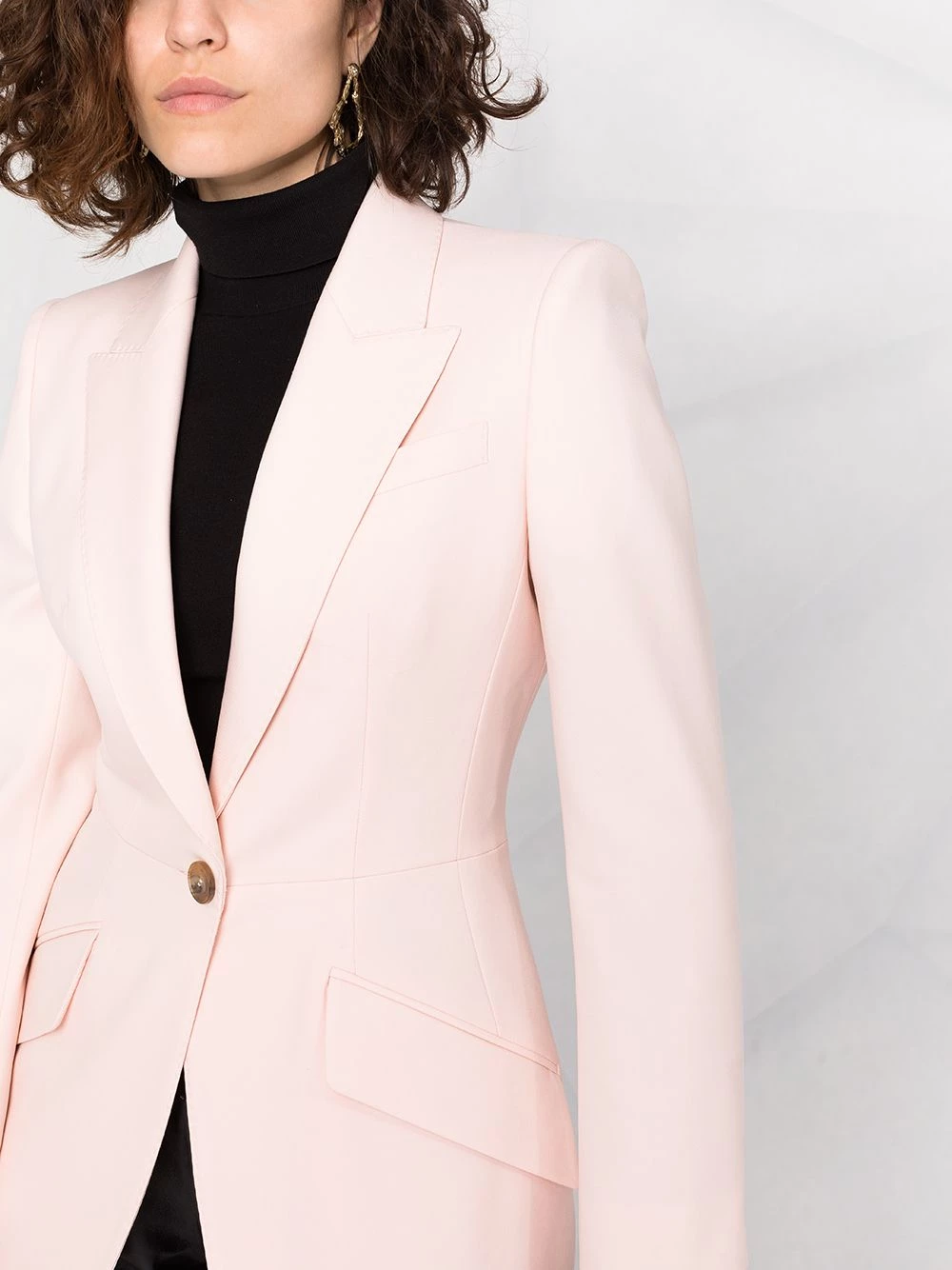 In a soft rose-pink hue, Alexander McQueen brings you the blazer your closet needs. Constructed from virgin wool and with a fitted cut, this single-breasted piece will get you business-ready easily. See you at the office?