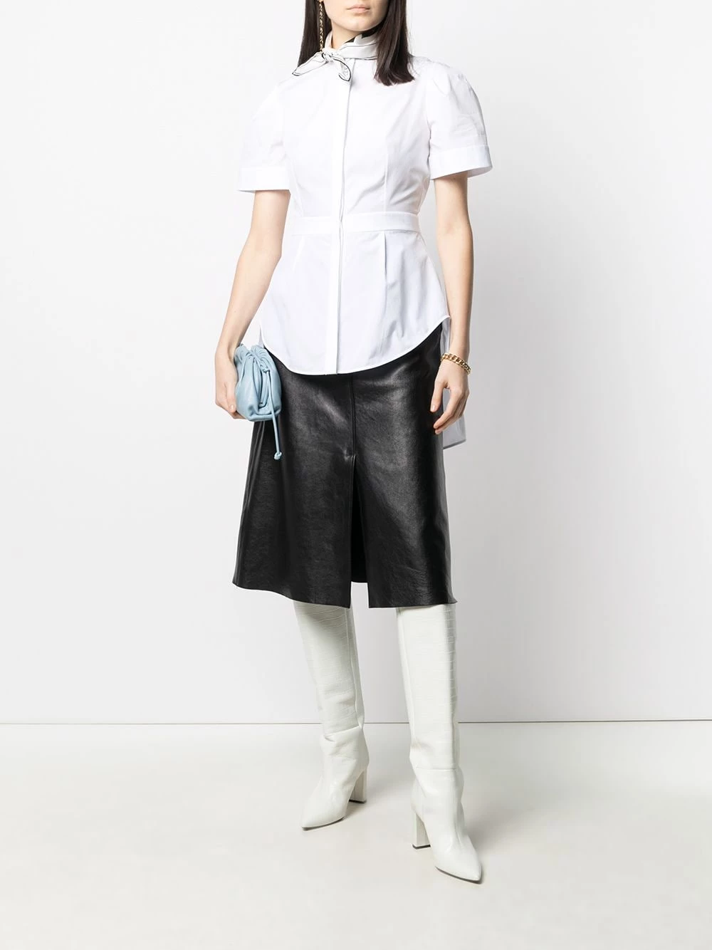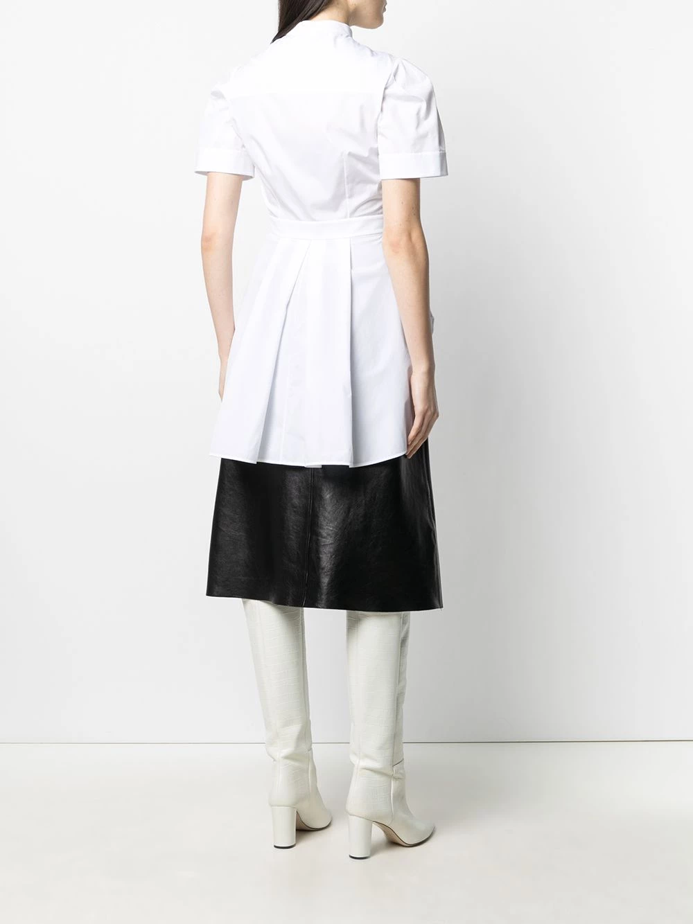 Add a contemporary touch. This collarless shirt from Alexander McQueen stands out due to its unexpected pleat detailing. You’ll plan look after look around it.