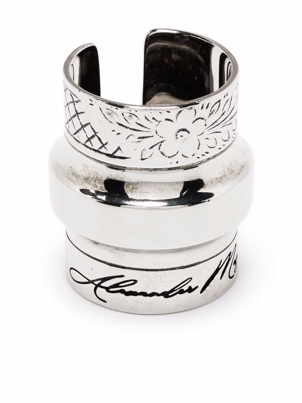 Alexander McQueen’s romantic alluring aesthetic is showcased in this unique and striking piece. Constructed from brass, this ring is engraved with the designerโs signature and floral motifs, adding a distinctive appeal to classic silhouettes.ย