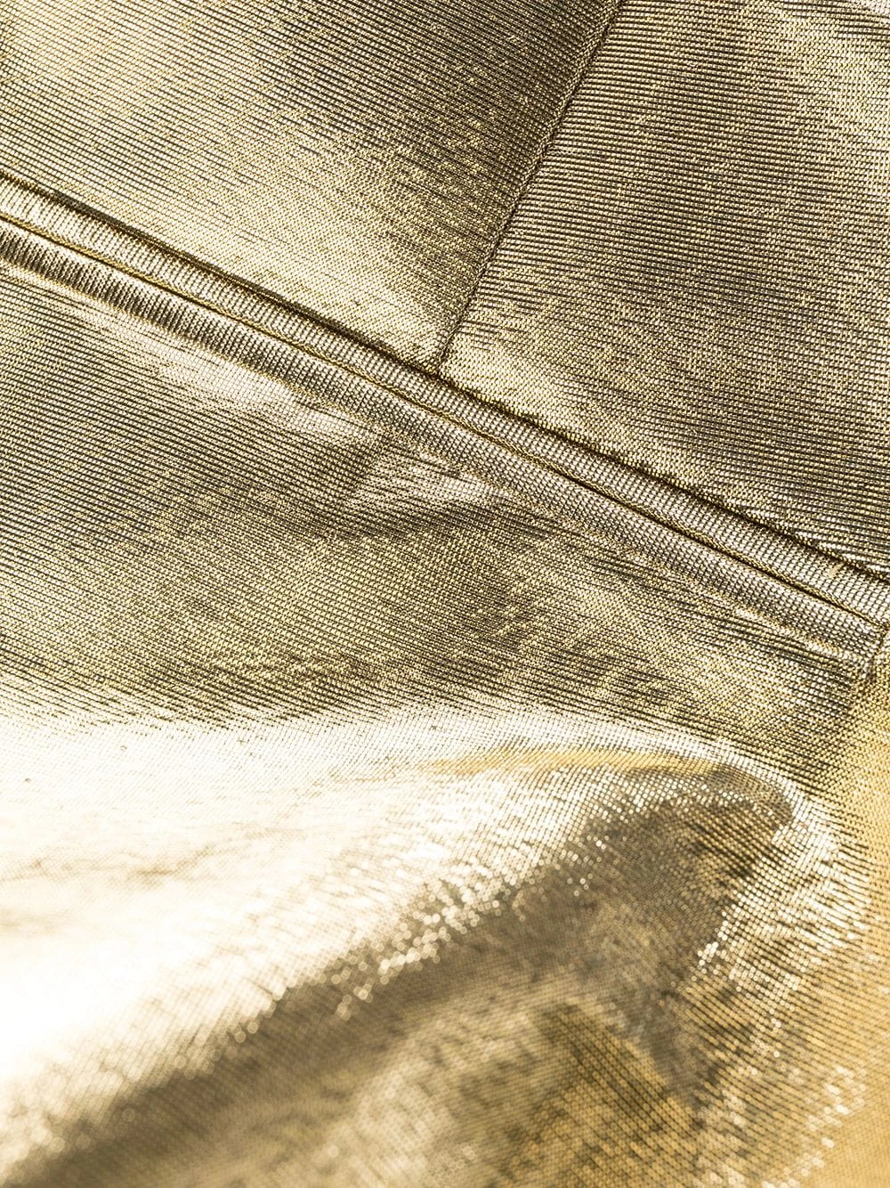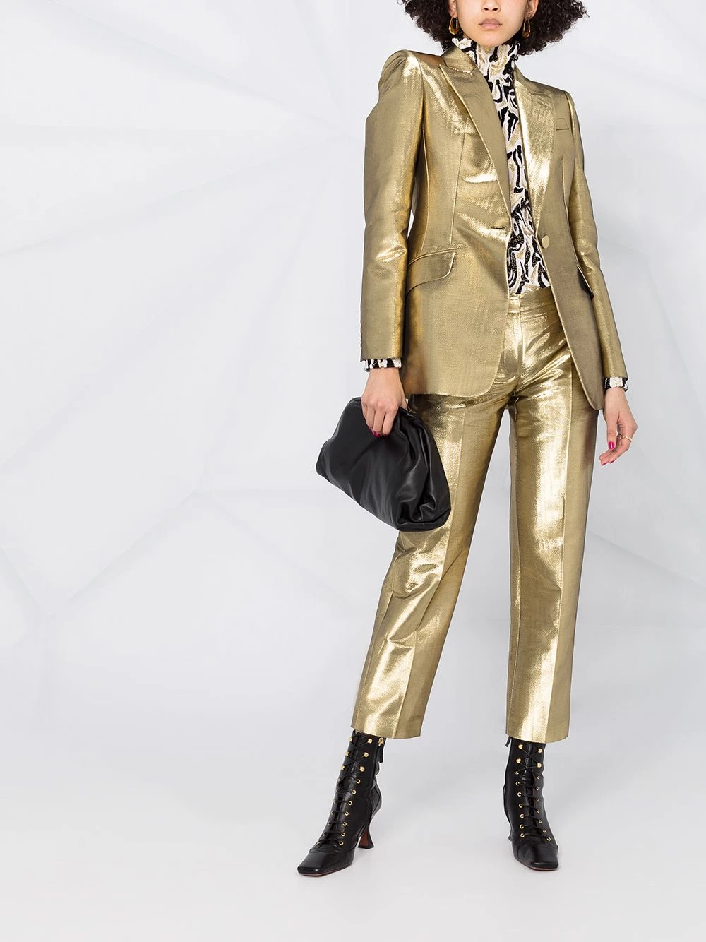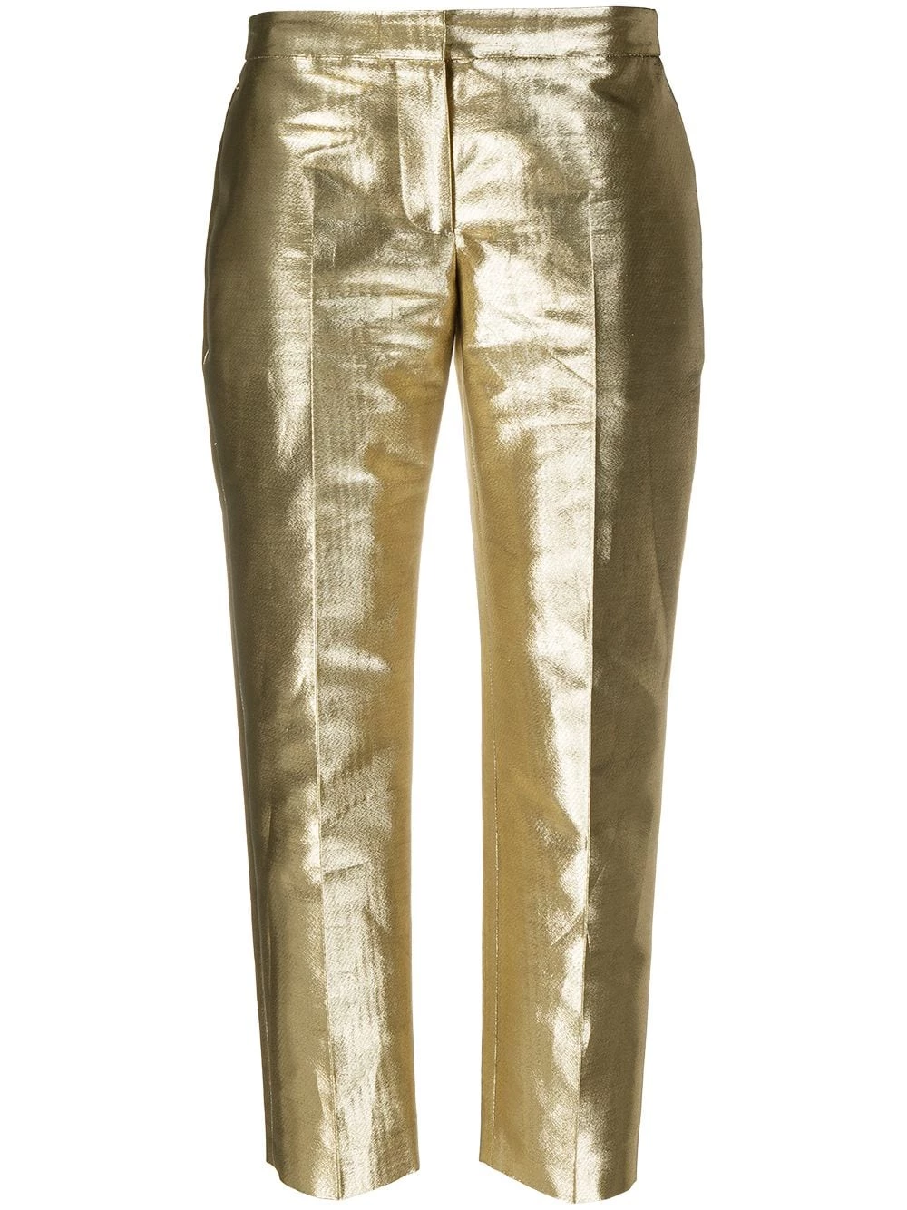 Make sure your wardrobe matches your competitive spirit with these Alexander McQueen trousers. In a sleek gold-tone hue, they will have you winning the fashion game. Go for gold.
