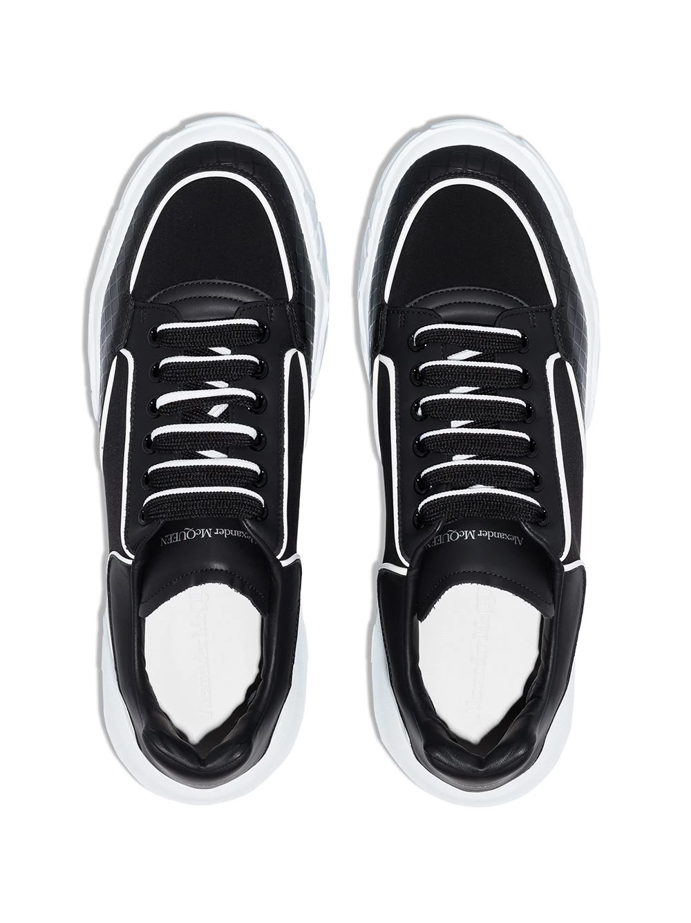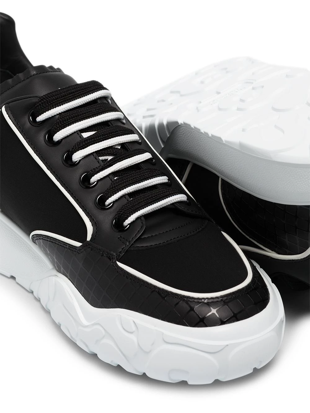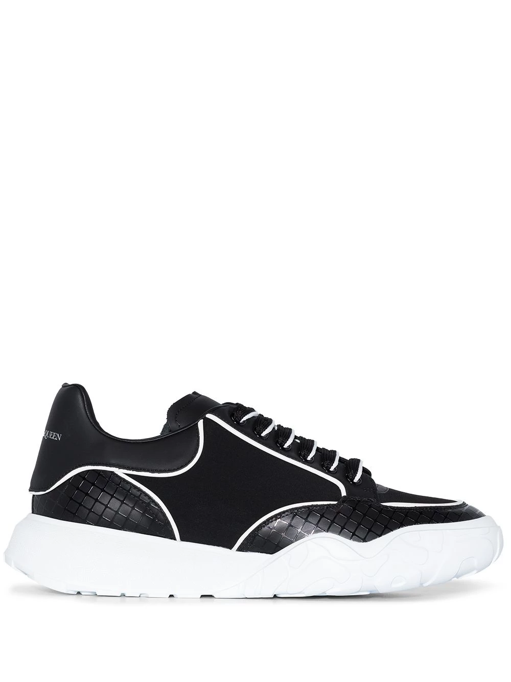 Alexander McQueen’s New Court sneakers have a sleek black design which is punctuated with a white contrasting piped trim across the upper and an oversize ridged rubber sole.