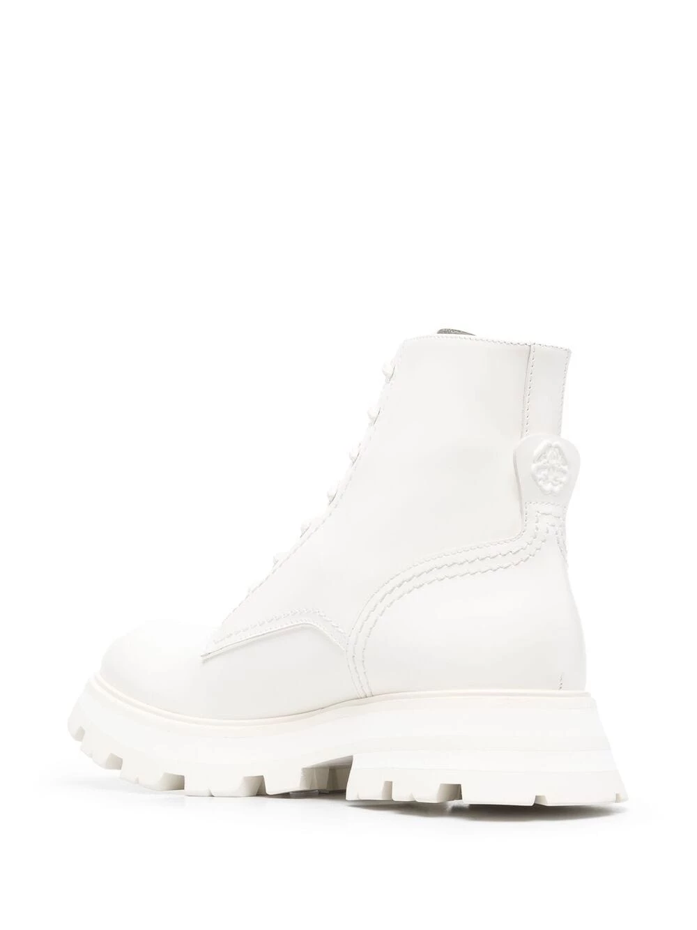 Just like the name it’s given, these Alexander McQueen boots were made to wander in. Crafted from bone white leather, they sit atop a thick tread sole and boast an embossed logo to the rear.