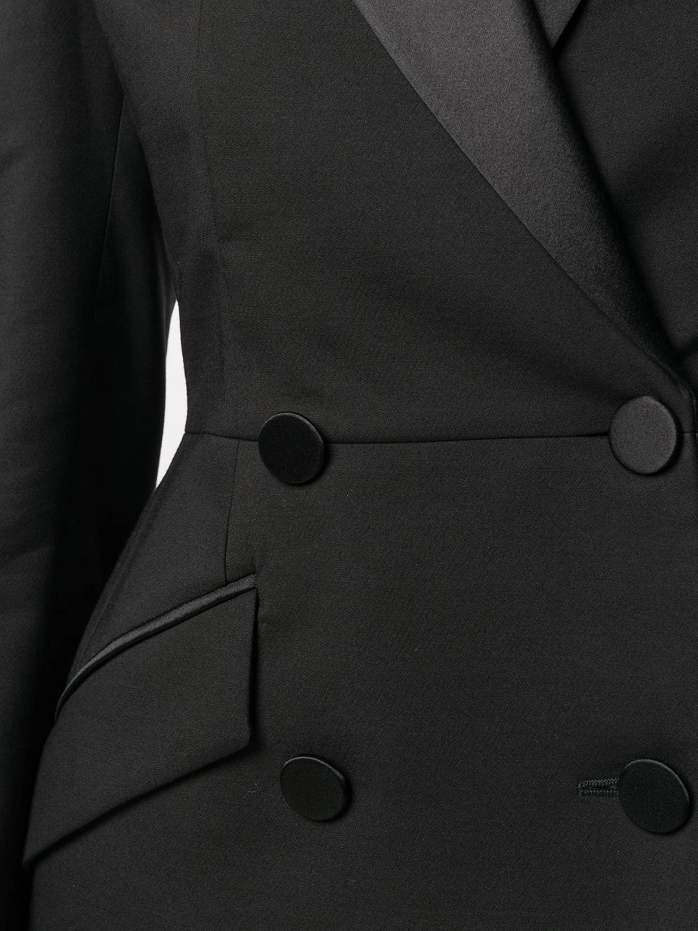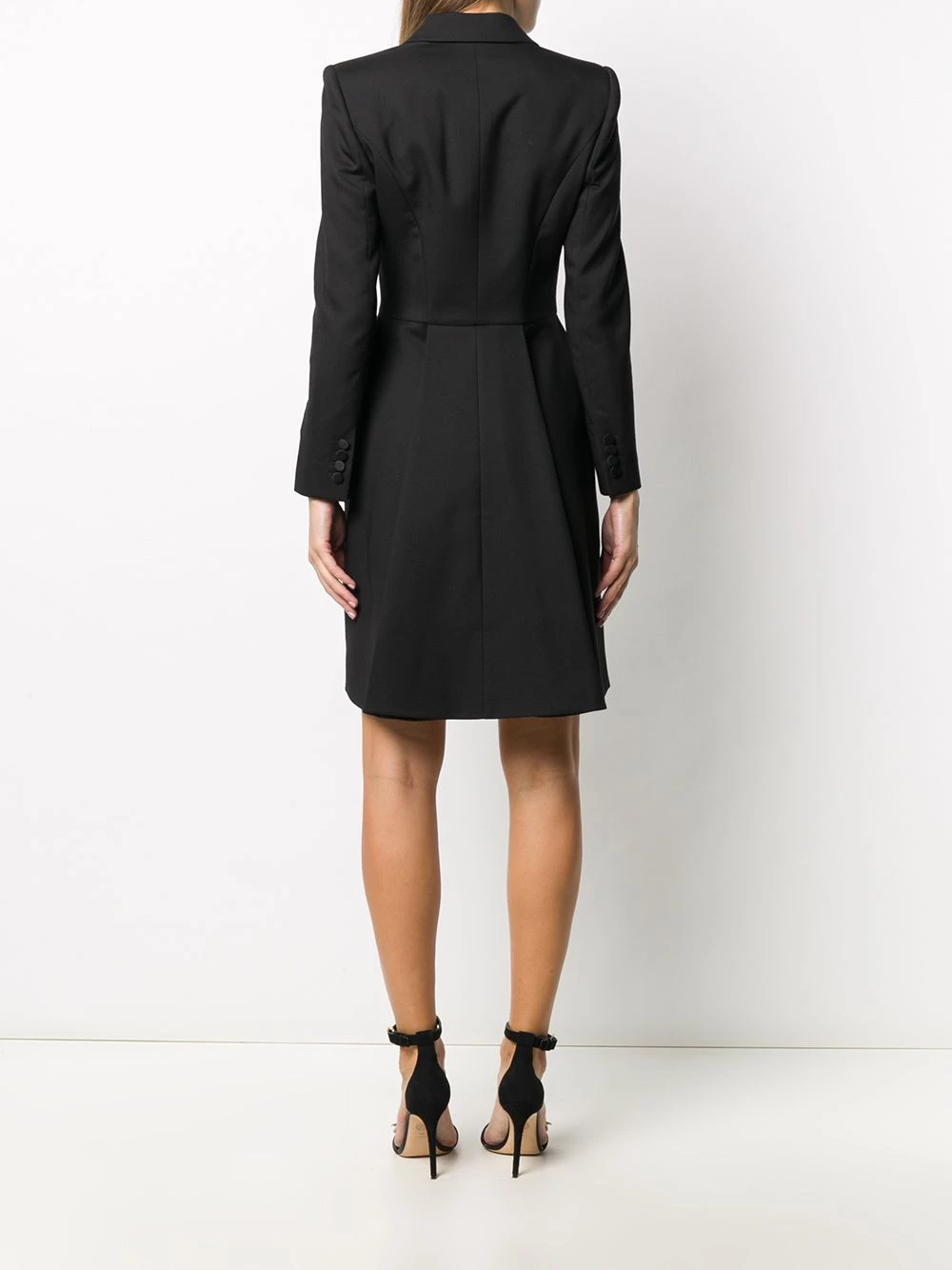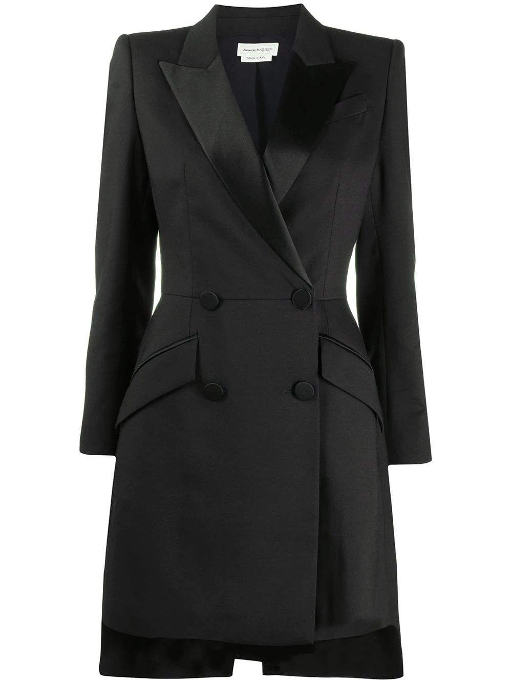 Empower your look with this double-breasted blazer dress from Alexander McQueen. Made from wool-silk blend, this tailored piece makes all the power moves for you with its satin peaked lapels, structured shoulders, and high-low hem. Make your mark.ย