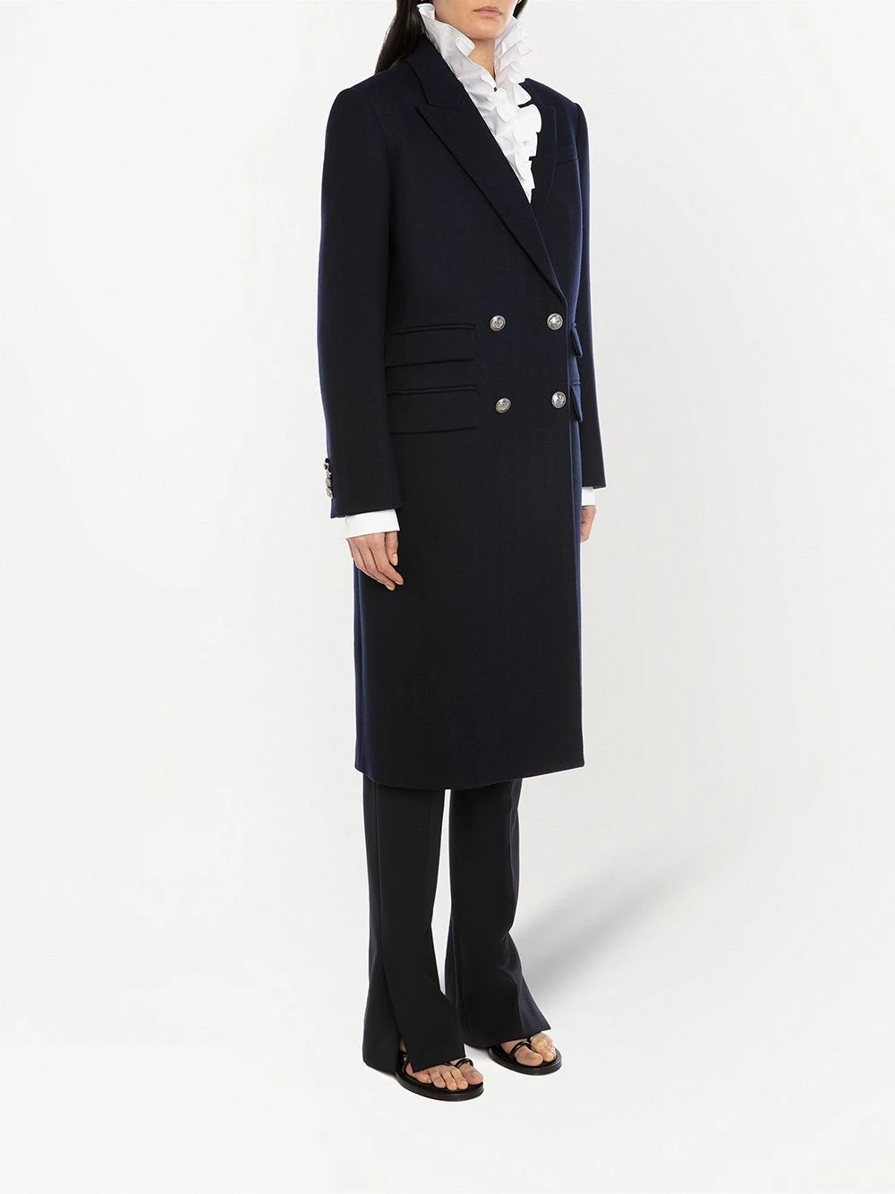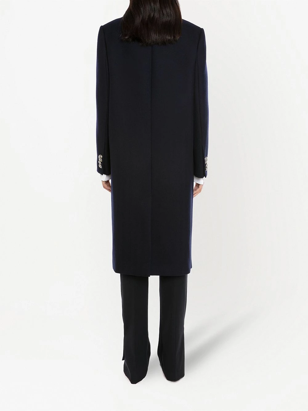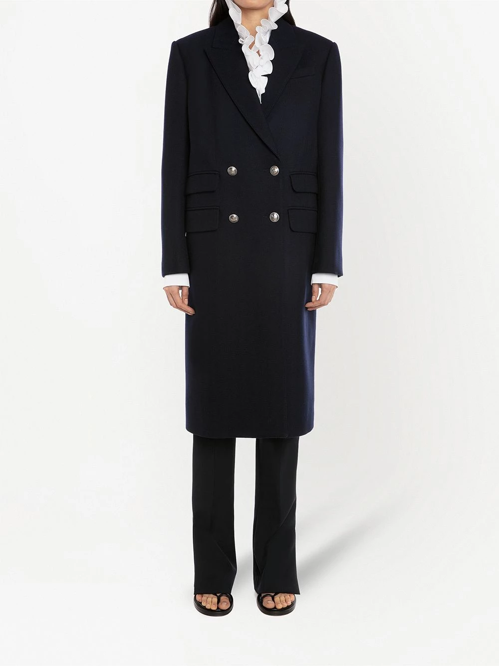 Alexander McQueen’s double-breasted coat boasts timeless appeal. Spun from wool with a touch of cashmere, this navy blue outerwear design delivers insulating warmth and uncompromised sleek style.