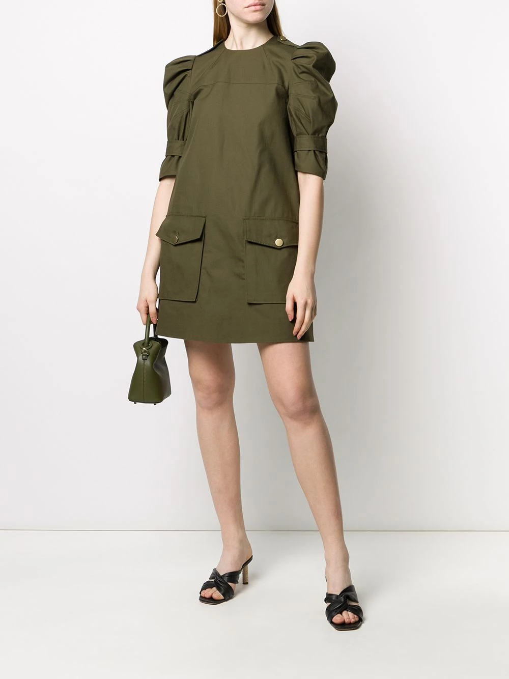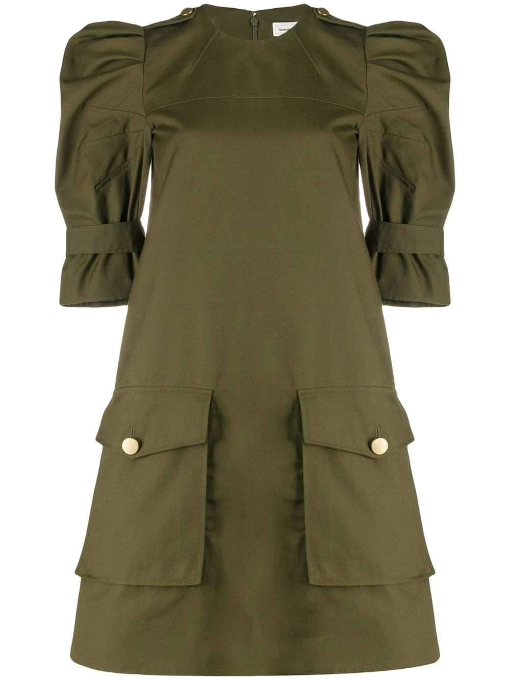Think of your outfit like your armour. Made from cotton, this khaki military-style mini dress from Alexander McQueen is fit for a warrior. Ready for battle. Featuring a round neck, short sleeves, ruched details, an a-line shape, a front buttoned flap pockets, a short length, a concealed rear zip fastening and button cuffs.