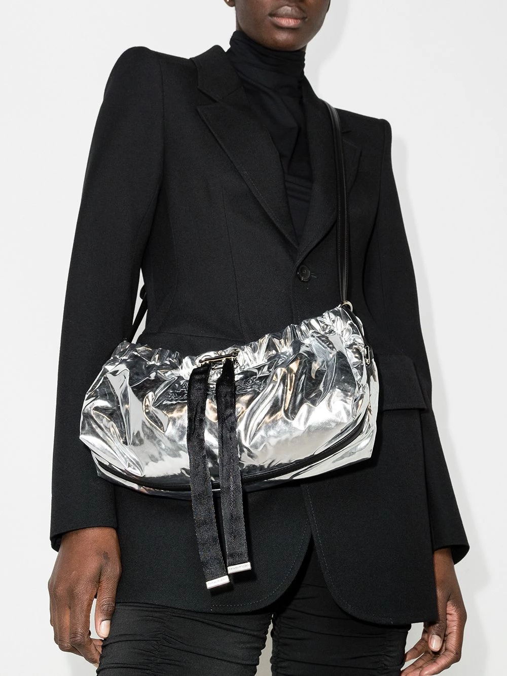 The Bundle mini shoulder bag gets its name from the bunched effect it gets when fastened with the drawstring top. Crafted in a bold metallic fabric it is enhanced by Alexander McQueen’s signature logo embroidered on the front.