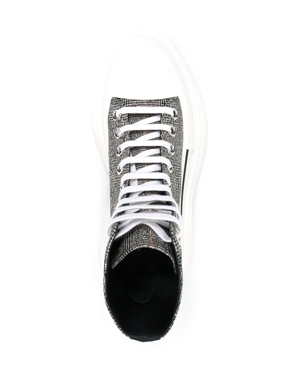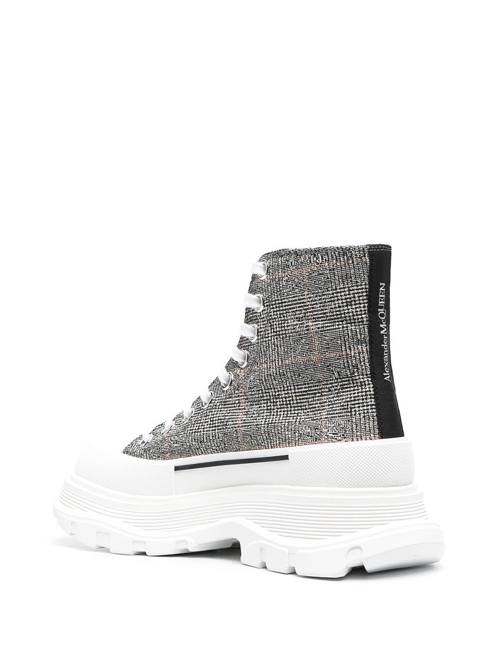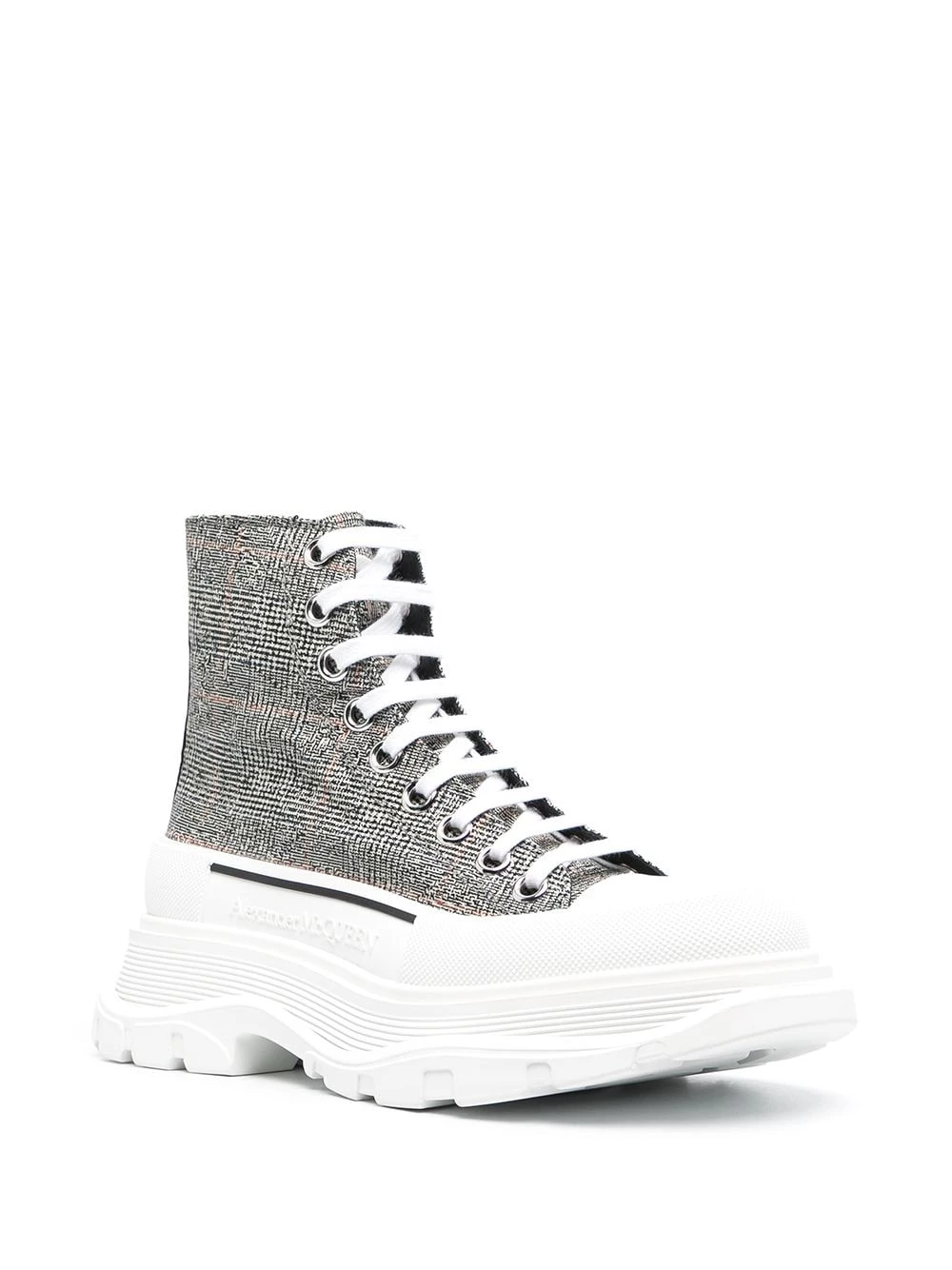 No need to stay home for warmth. Stamp out of winter hibernation in this pair of chunky sole Tread Slick sneakers by Alexander McQueen, boasting a virgin wool check print body. Puddles? Snow? No problem.ย