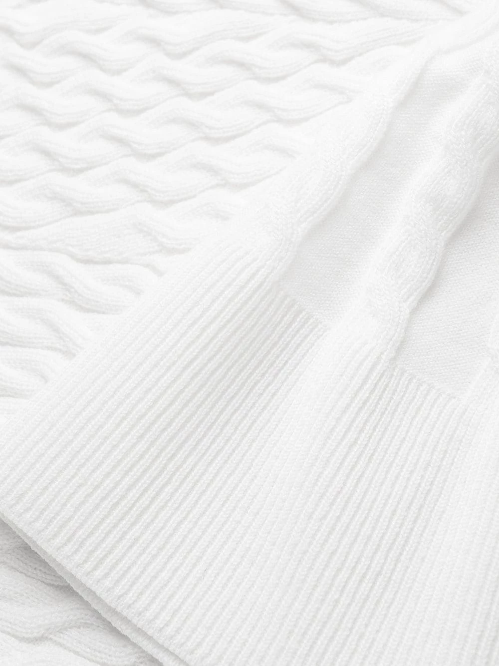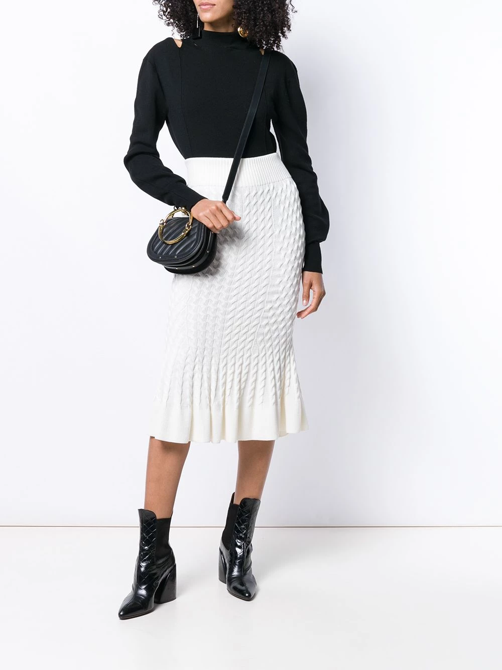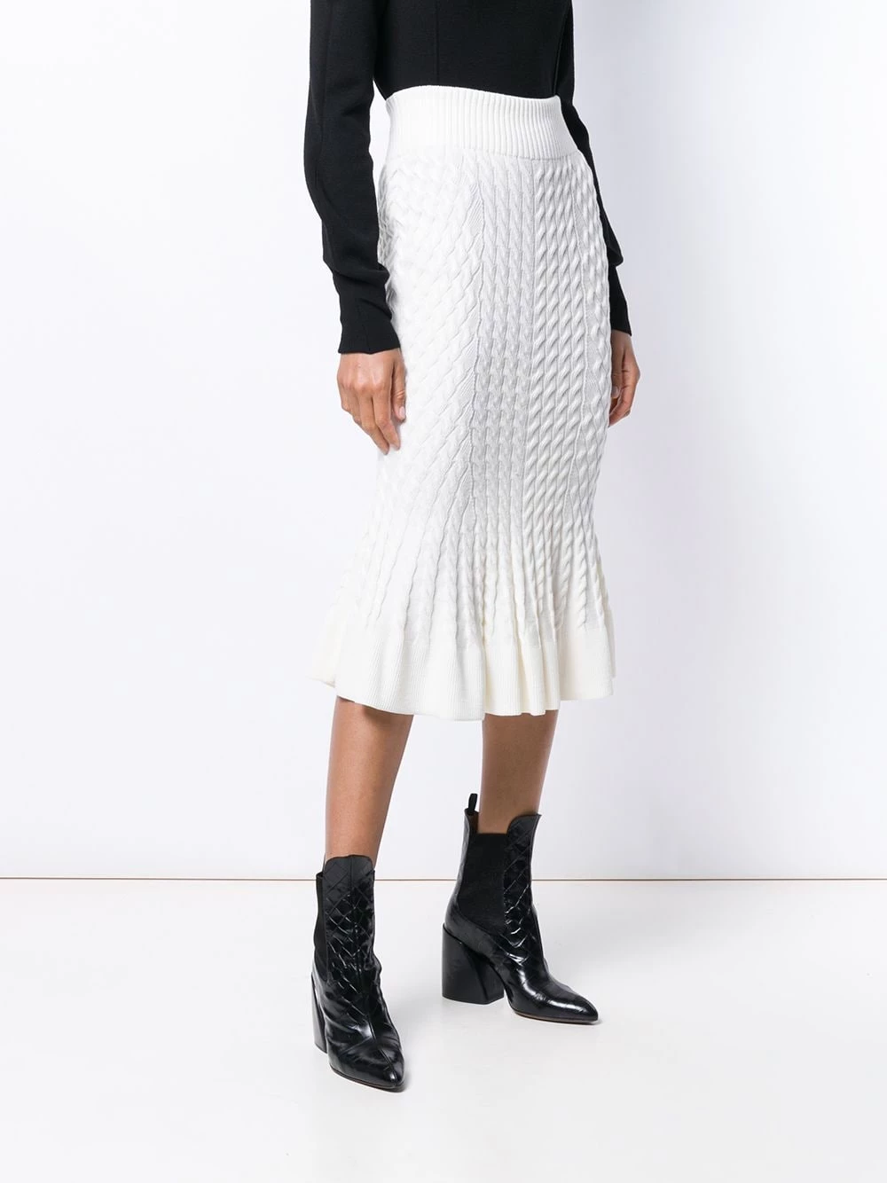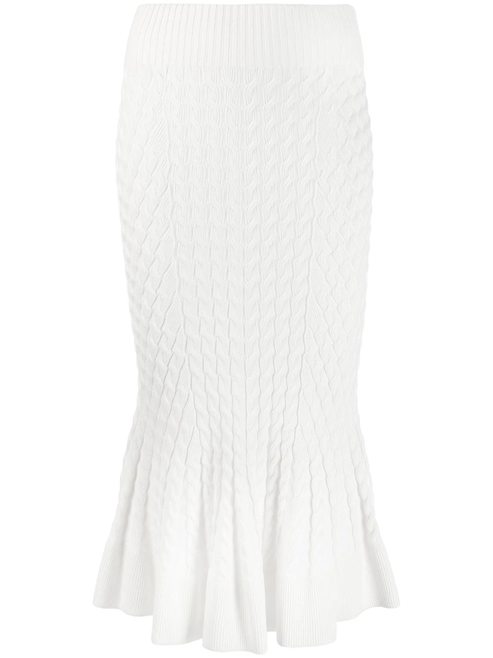 Ivory white wool blend knit trumpet midi skirt from Alexander McQueen featuring a ribbed waistband, a cable knit, a fitted silhouette, a ribbed hem, a mid-length and a trumpet shape.