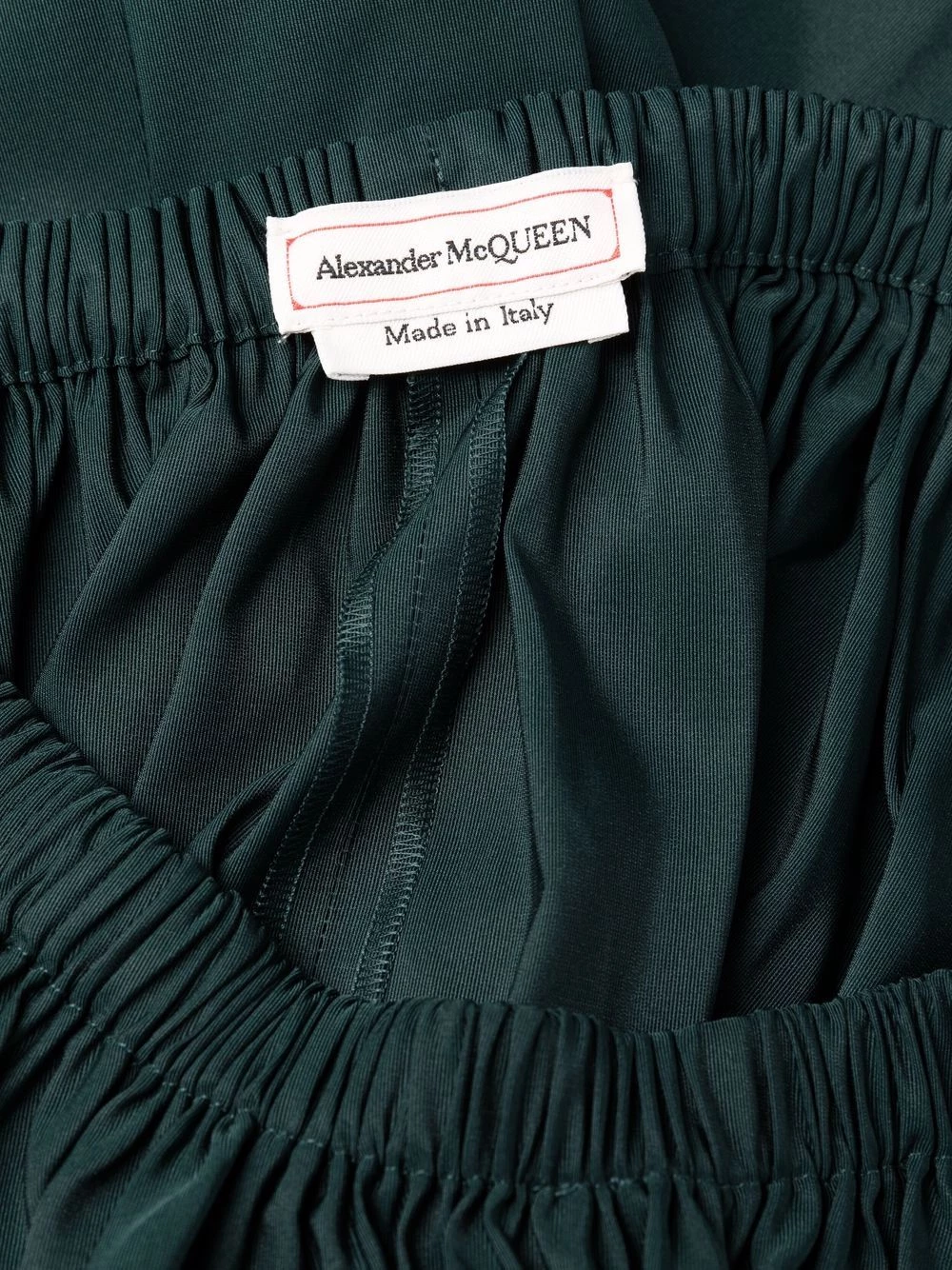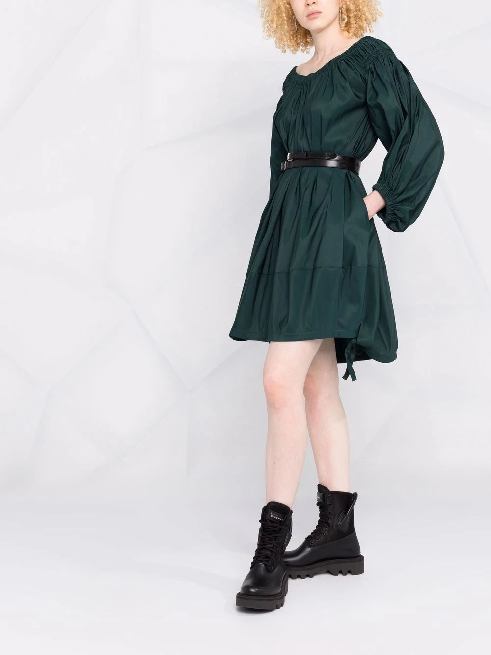 Textured detailing and voluminous silhouettes are both highlighted here with Alexander McQueen’s dress. From its ruched design and flowy silhouette, this green number can be adjusted with the drawstrings positioned at the hem.