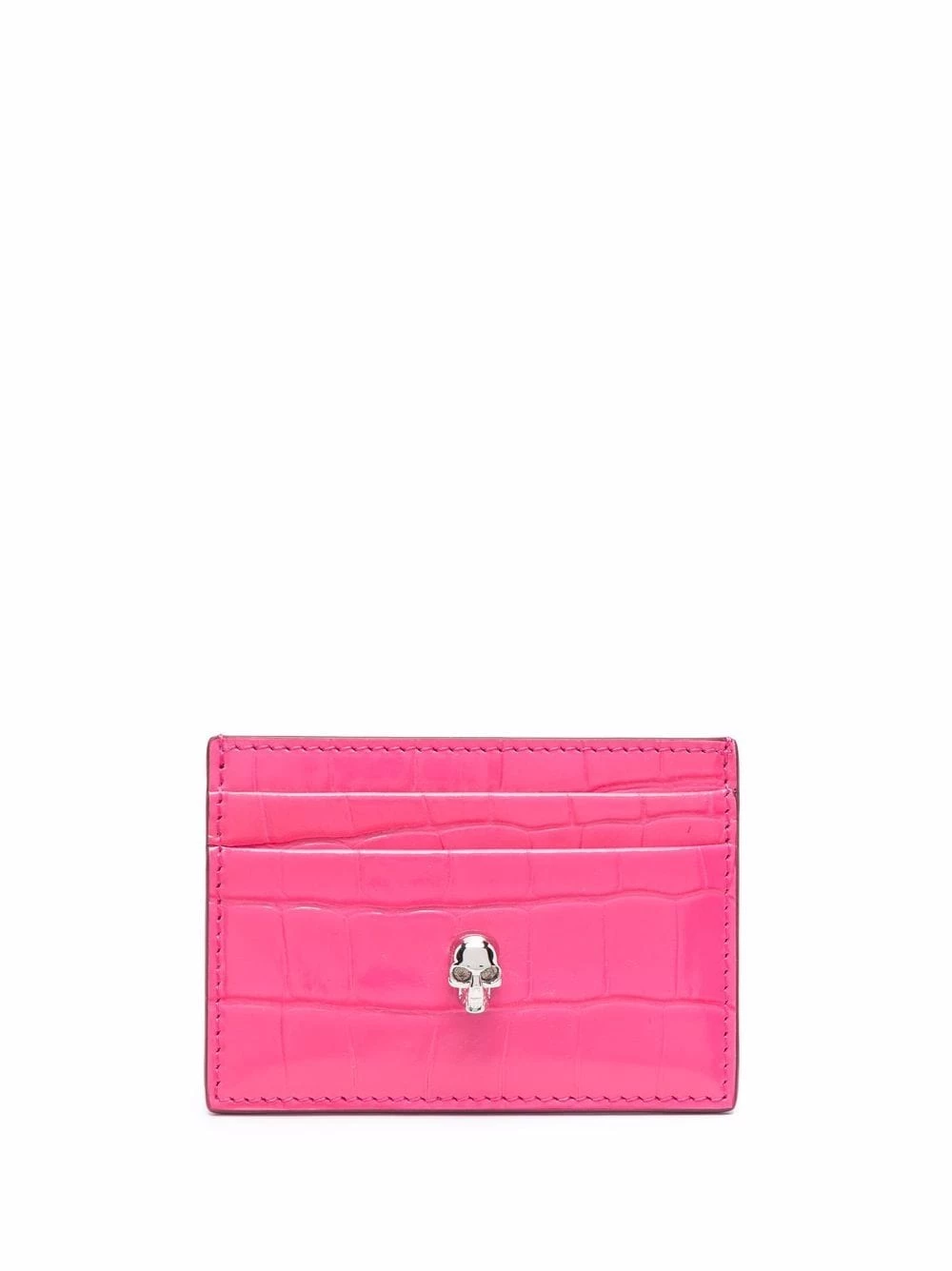 Hot-pink leather skull-appliqué leather cardholder from Alexander McQueen featuring embossed crocodile effect, skull appliqué, embossed logo to the front and card slots.