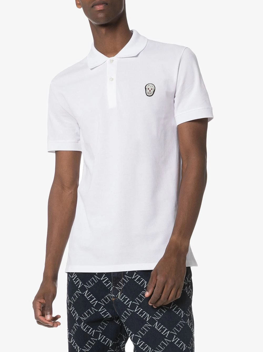 For many years, the skull has been a long-standing emblem of Alexander McQueen, capturing the brandโs dark yet alluring essence. This white cotton Skull logo-embroidered polo shirt from Alexander McQueen features a classic collar, a front button fastening, short sleeves and a logo to the chest.