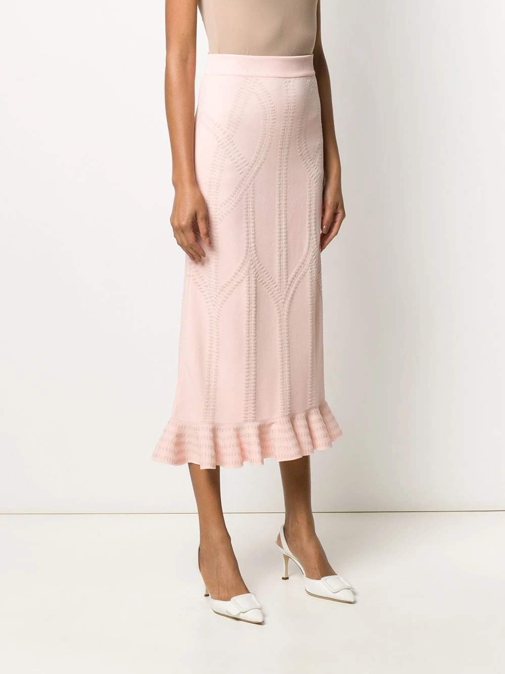 Why blend in when you can wear McQueen? This baby pink textured knitted frilled skirt from Alexander McQueen will make sure all eyes are on you, no matter the room you find yourself in. You’re a star – shine bright like one. Featuring a high waist, a knitted style, ribbed trimming, a textured style and layers of frills.