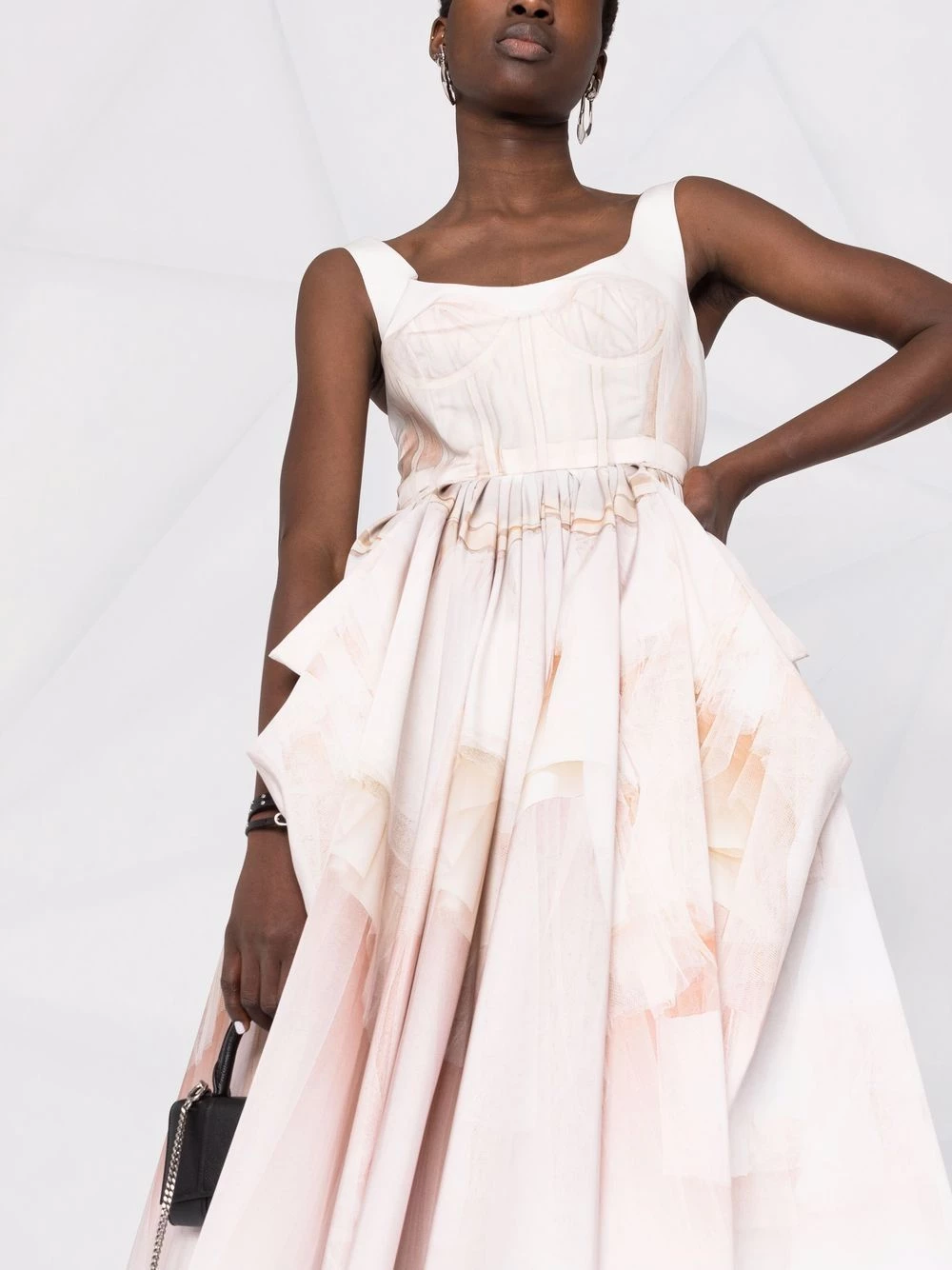 Alexander McQueen takes you to fantasy land with this tulle toile bow drape dress. Designed with an engineered tulle toile print, corsetry-inspired detailing and an exploded skirt, this romantic piece will have you feeling as though you’ve just stepped into a contemporary romantic novel.ย