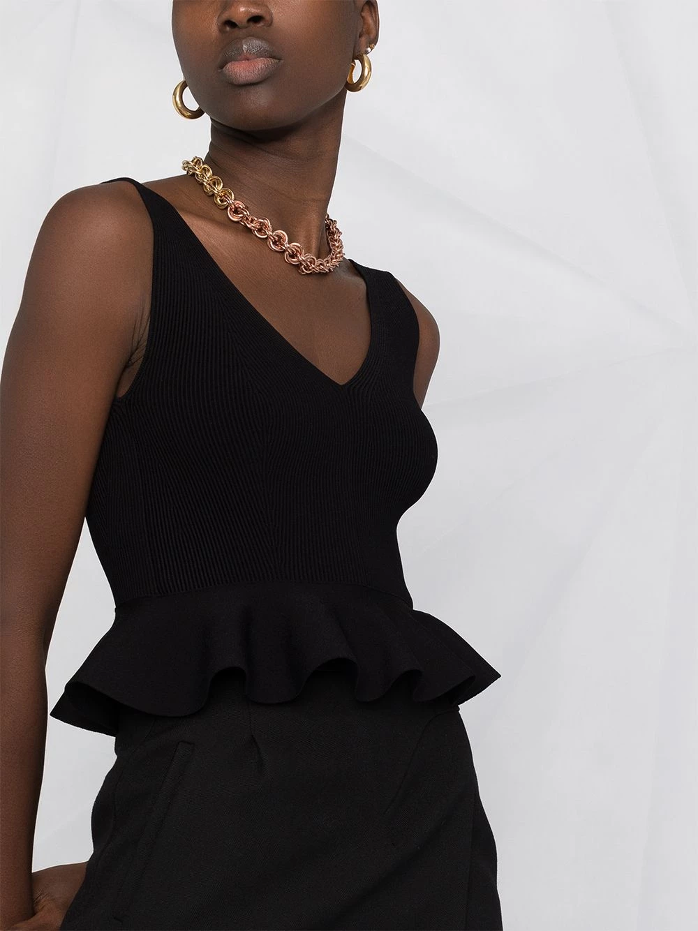 Put some pep in your step, with a peplum hem. In a ribbed knit construction, this top from Alexander McQueen boasts a jet black hue and a peplum silhouette that gives the piece a sense of the dark luxury for which the brand is known. Find the light in the dark.