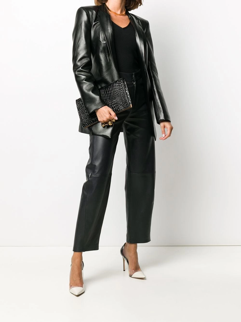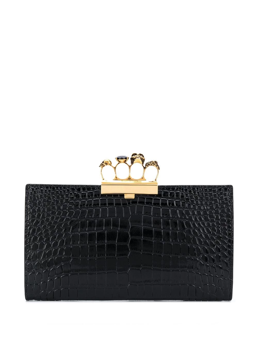Carry your essentials in style with this black Four Ring clutch bag from Alexander McQueen. Complete with an iconic skull embellishment and an embossed finish, this one’s a staple party accessory. In true McQueen style.