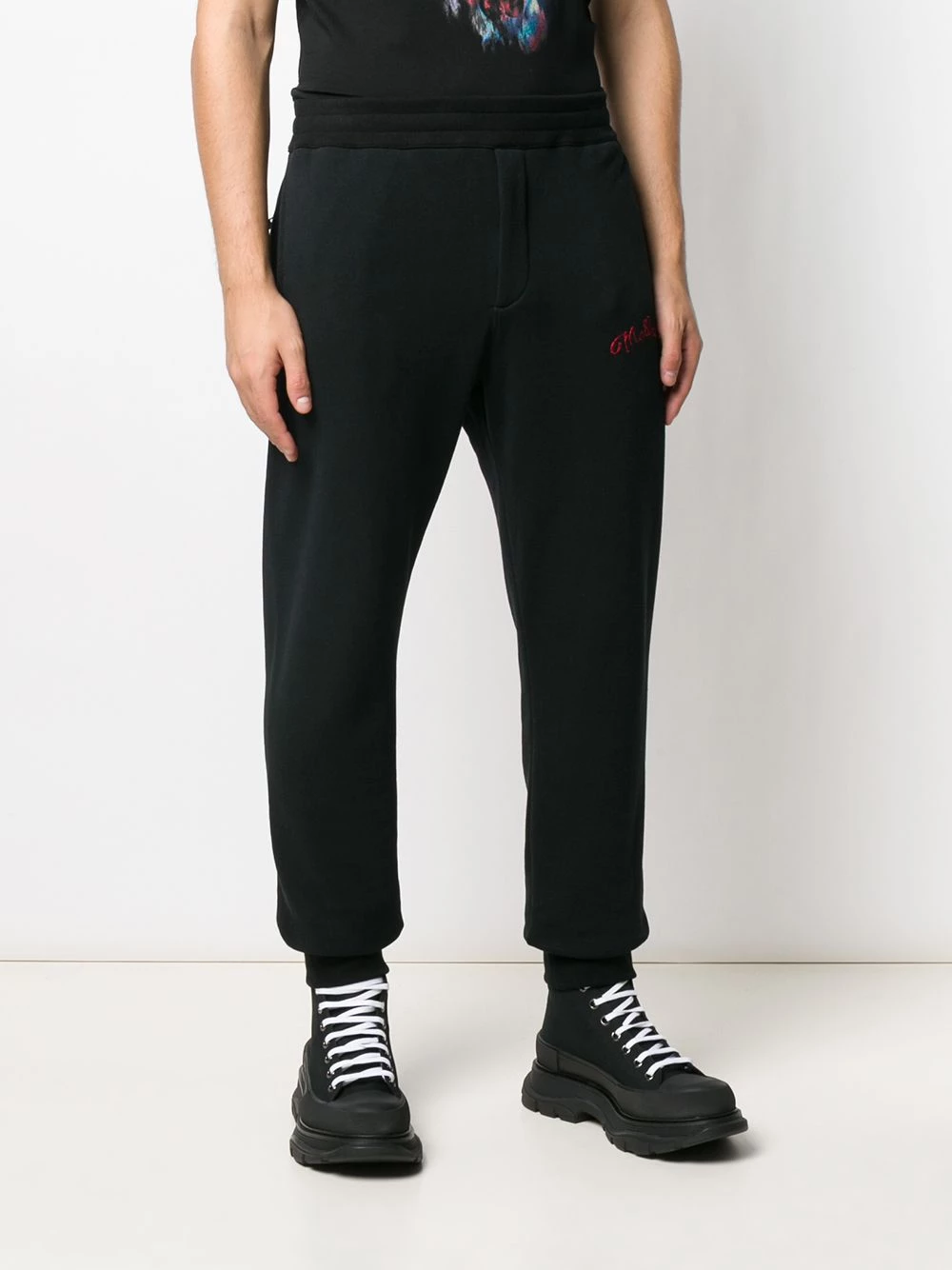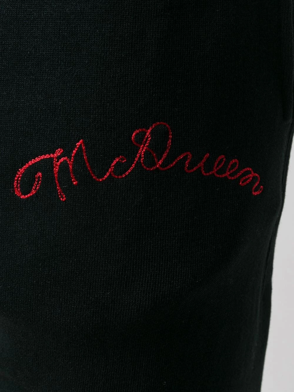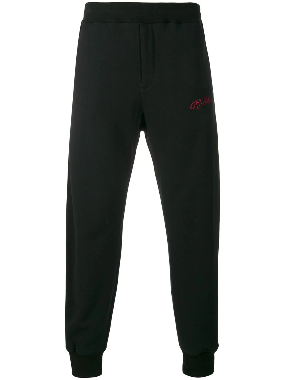 Gym classes but make it fashionable. Made from cotton, these black cotton logo embroidered track pants from Alexander McQueen are not your regular gym wear. Training in McQueen? How fancy of you. Now it’s time to sweat. Featuring an elasticated waistband, a back zip pocket, side slit pockets, a regular length, a tapered leg, elasticated ankle cuffs and a contrasting red logo embroidered to the front.