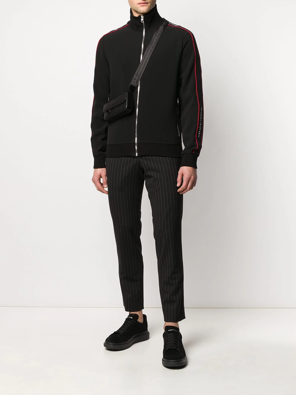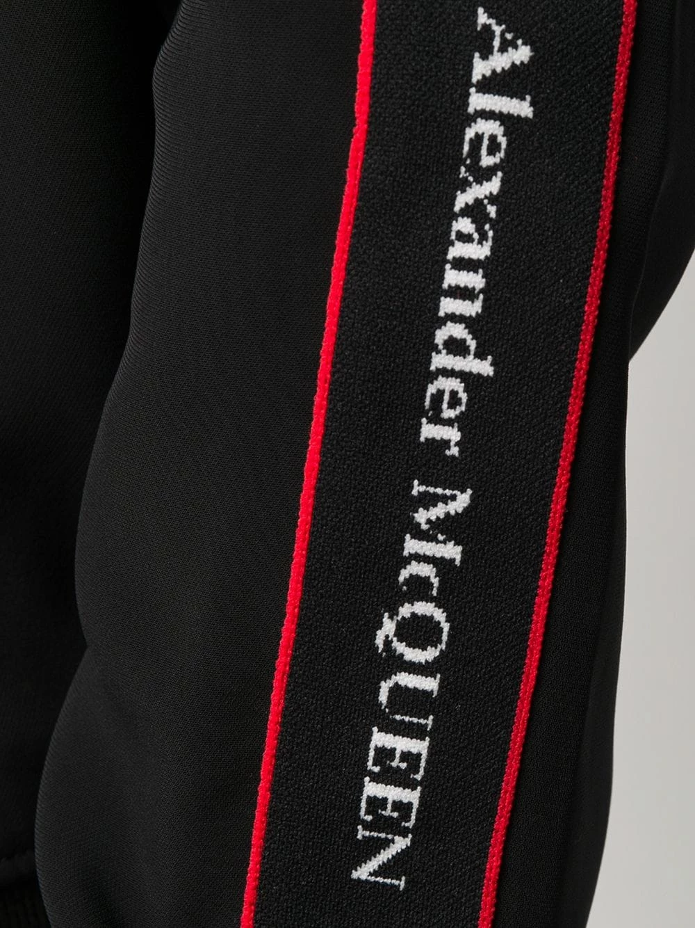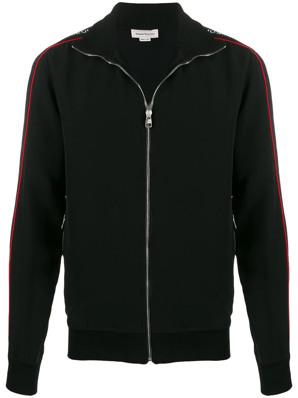 Keep it casual all you want – but do it in style. Crafted from cotton, this black track jacket from Alexander McQueen is detailed with white and red logo tape to the sleeves for an extra cool touch. The go-to for a relaxed day off. Featuring a funnel neck, a front zip fastening, long sleeves, side zipped pockets and a ribbed hem and cuffs.