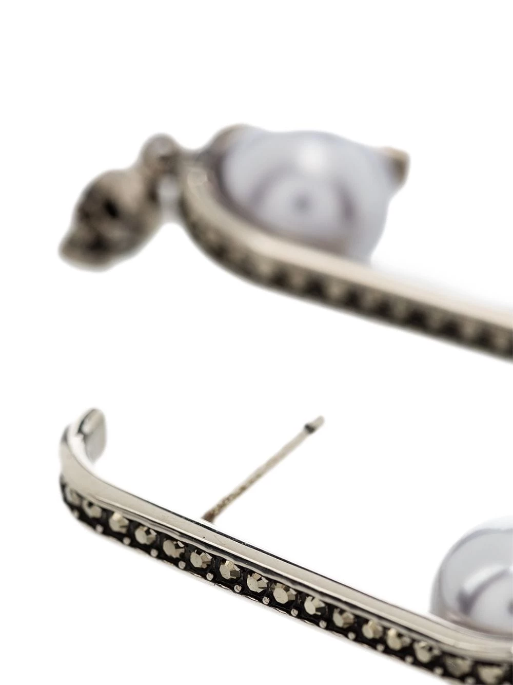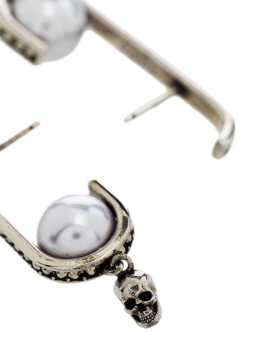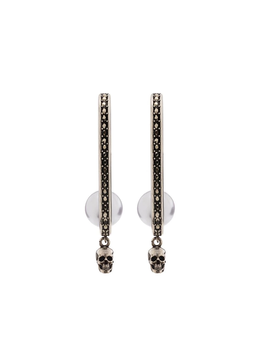 The faux pearl and skull charms that suspend from Alexander McQueenโs drop earrings balance the houseโs gothic and romantic aesthetic. Theyโre crafted from antique silver-tone brass to a drop silhouette with a signature skull charm.