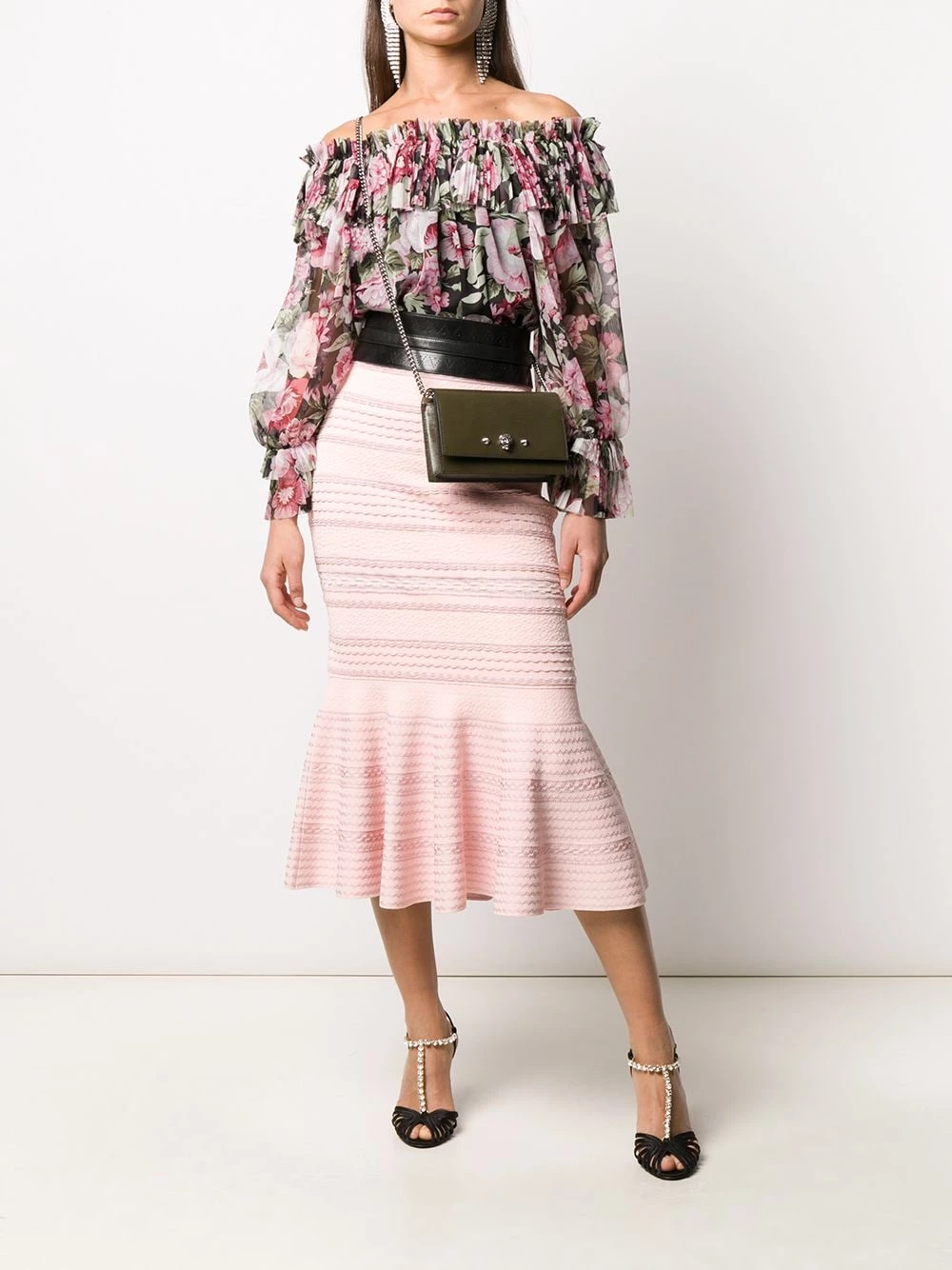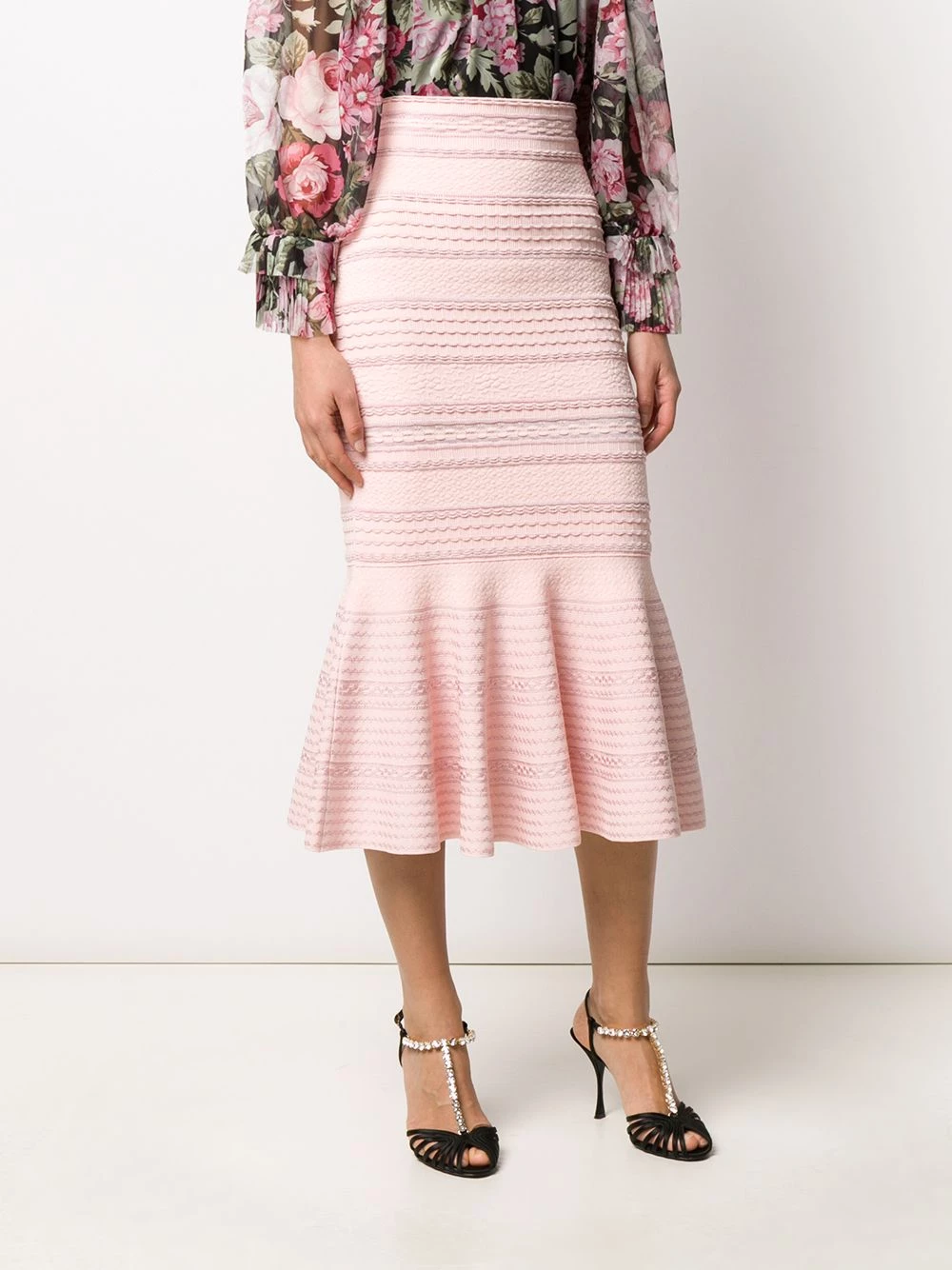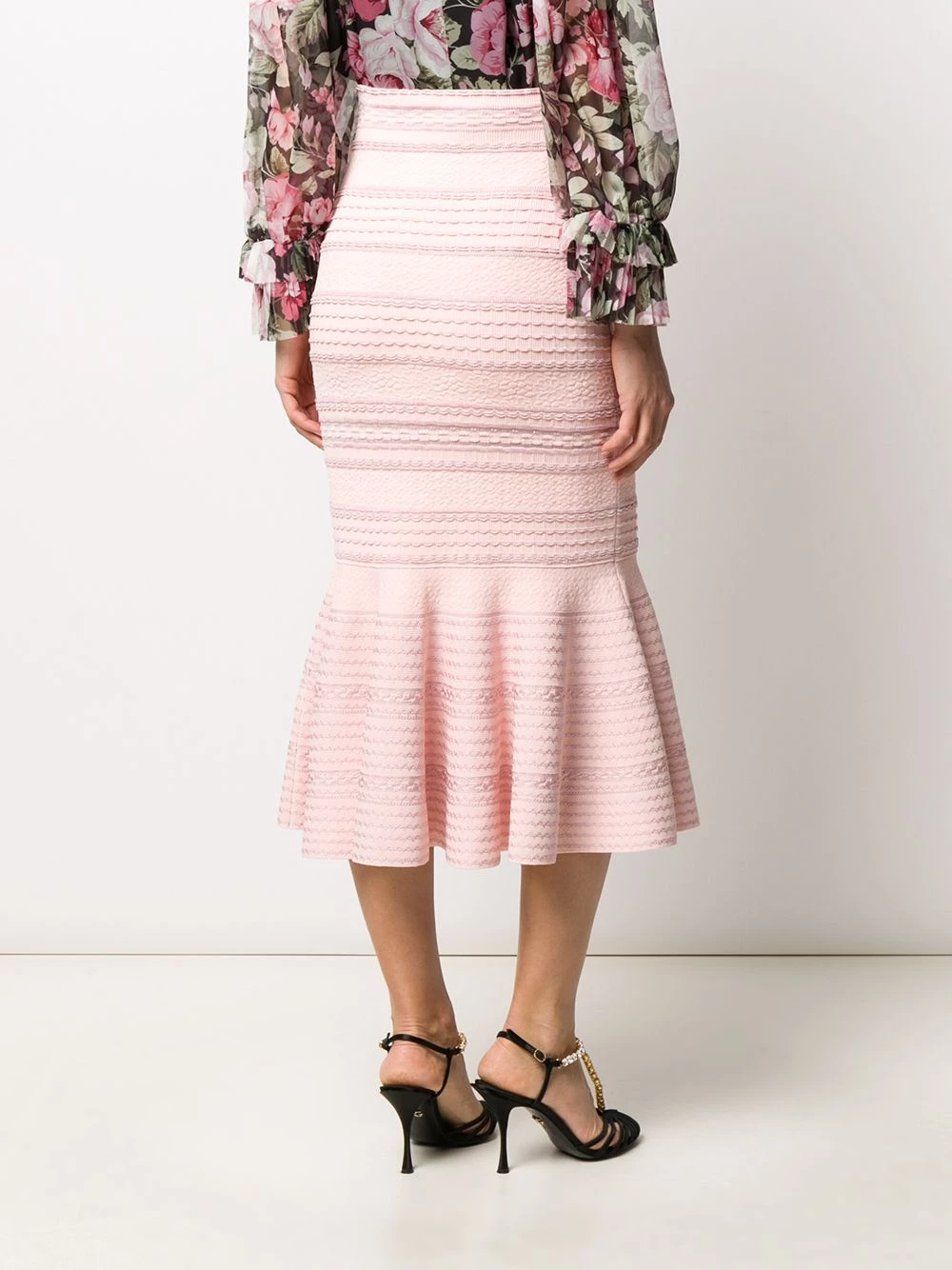 Want to be the person all eyes are on? Make a statement when you enter a room? Yes? You need this peplum hem midi skirt from Alexander McQueen. Beautifully elegant. Featuring a high waist, a slim fit, a textured style, scalloped details, a mid-length and a peplum hem.