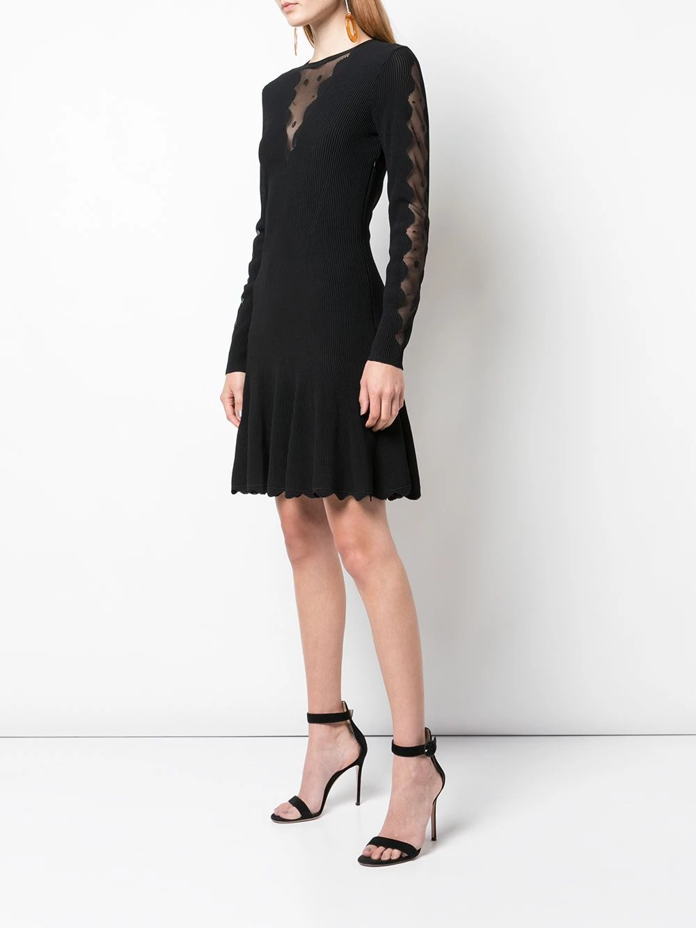 The little black dress is a necessity. Opt for this darkly-alluring version from Alexander McQueen. It boasts scalloped mesh inserts and a flirty skater skirt. With it’s timeless shape and dark colourway, you’ll be reaching for this frock over and over again. Featuring a crew neck, long sleeves, a back button fastening and a flared skirt.