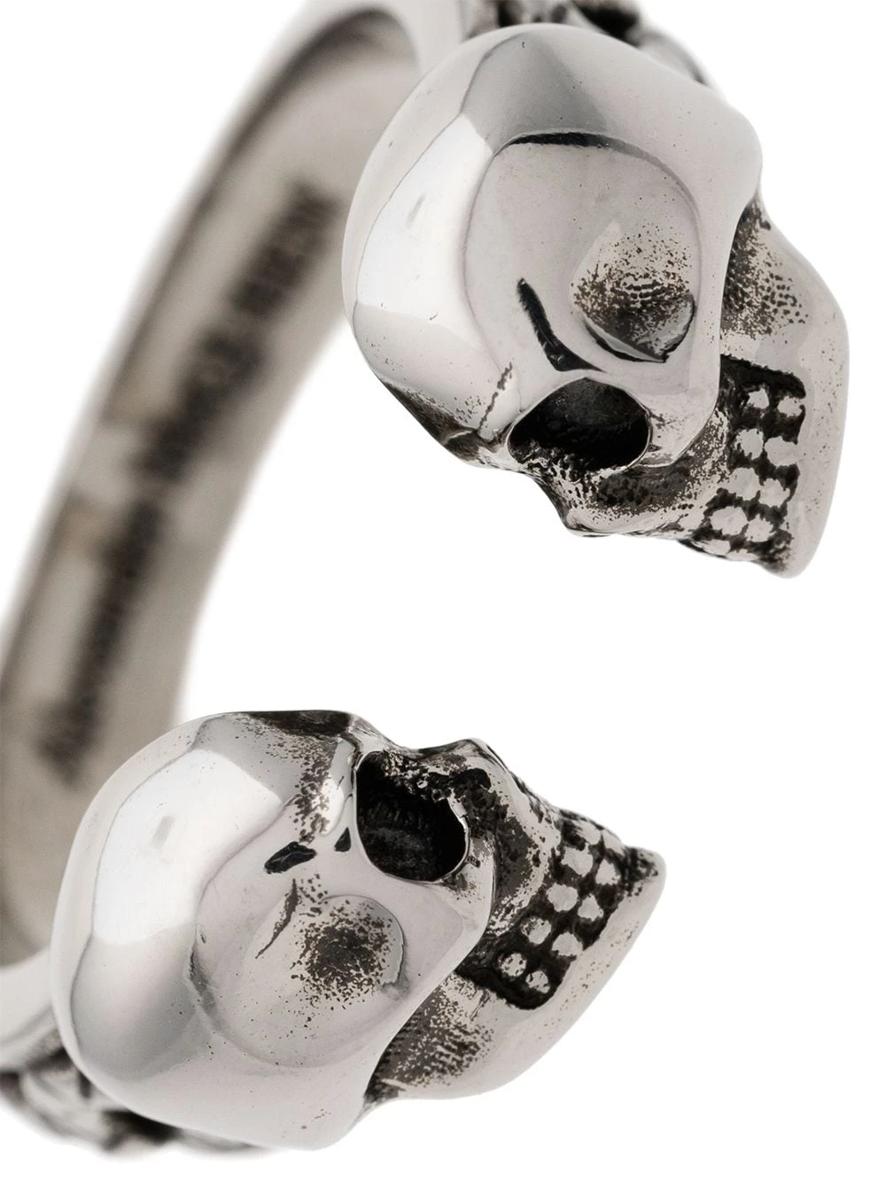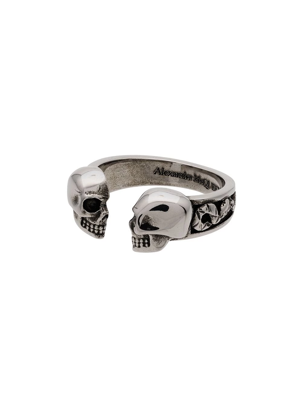For many years, the skull has been a long-standing emblem of Alexander McQueen, capturing the brandโs dark yet alluring essence. Made from brass, this silver-tone ring features the brand’s signature skulls and an engraved design.